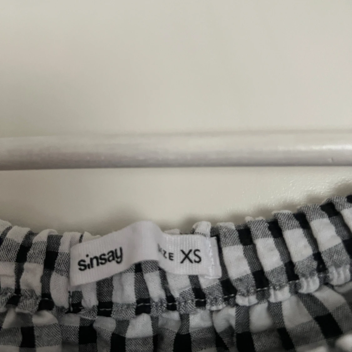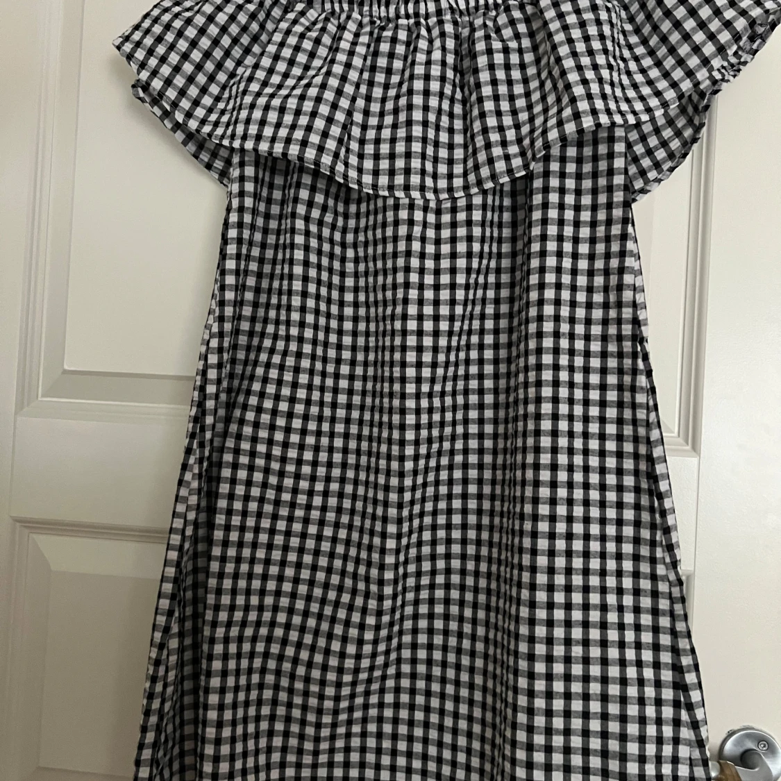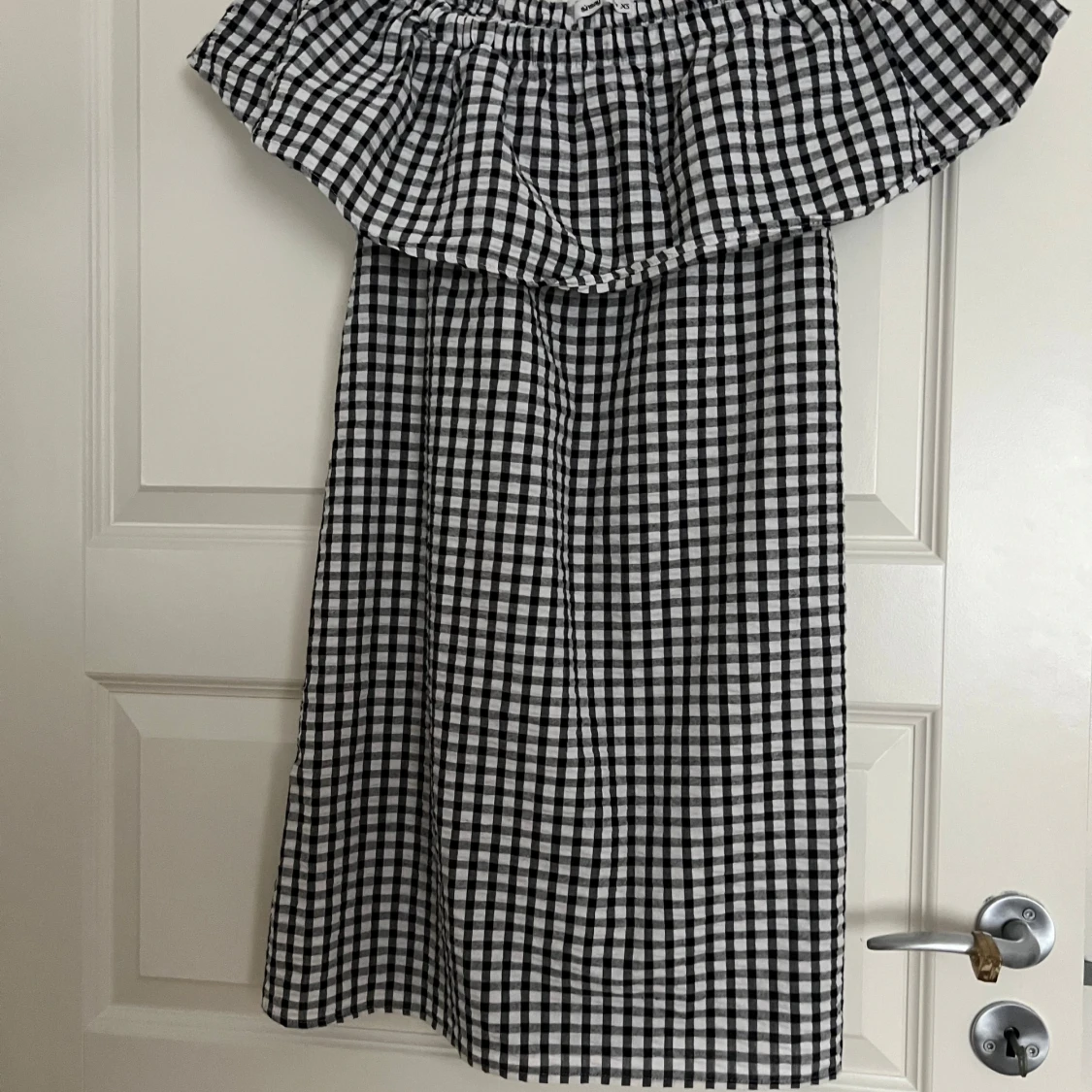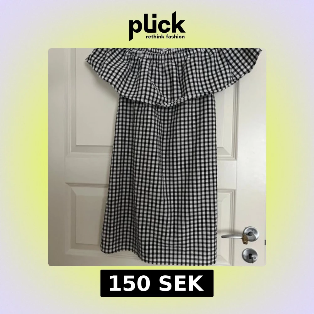 Supersöt svartvit rutig offshoulder klänning från Sinsay i storlek XS. Klänningen har volang upptill och är ärmlös, perfekt för varma dagar. Den är kort och har en luftig passform som känns både trendig och bekväm.