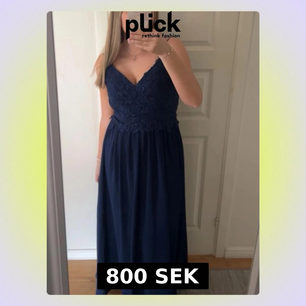 Säljer en marinblå långklänning med smala axelband och v-ringad hals. Livet är dekorerat med spets och har fina broderade detaljer. Kjolen faller mjukt och klänningen har en elegant och tidlös look. Perfekt för dig som vill sticka ut på bal eller fest.
