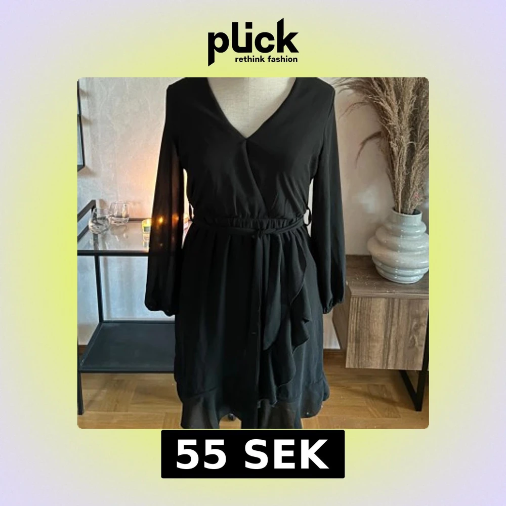 Stilren svart omlottklänning med v-ringning, långa transparenta ärmar och knytband i midjan. Kjolen har volangdetalj och lätt flowy känsla. Perfekt för dig som gillar en klassisk look med lite extra edge.