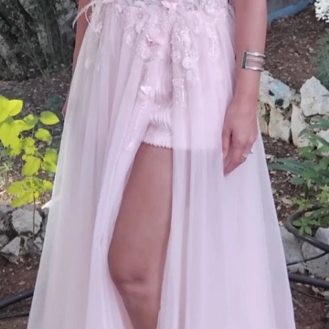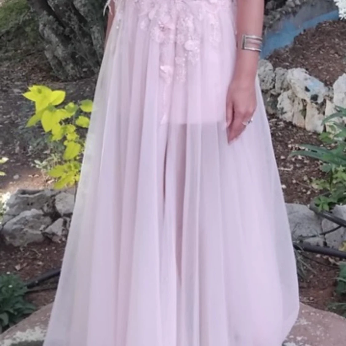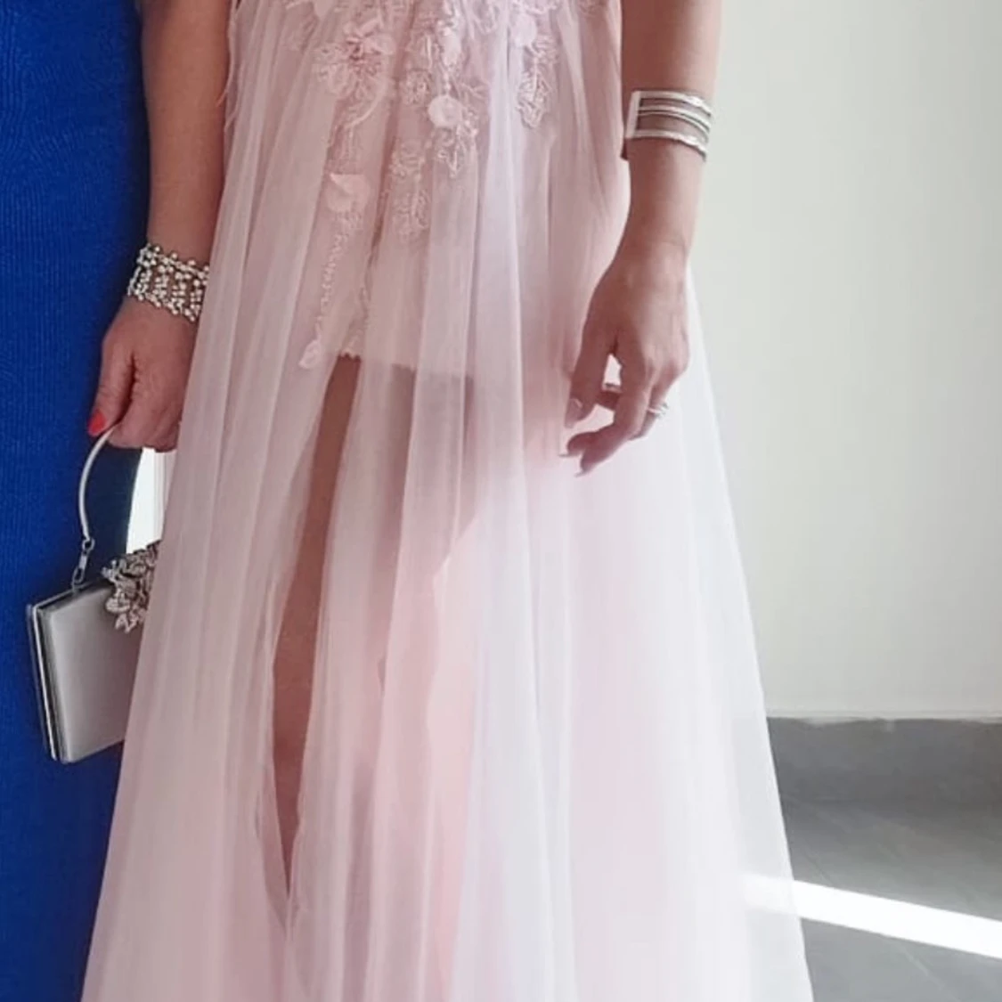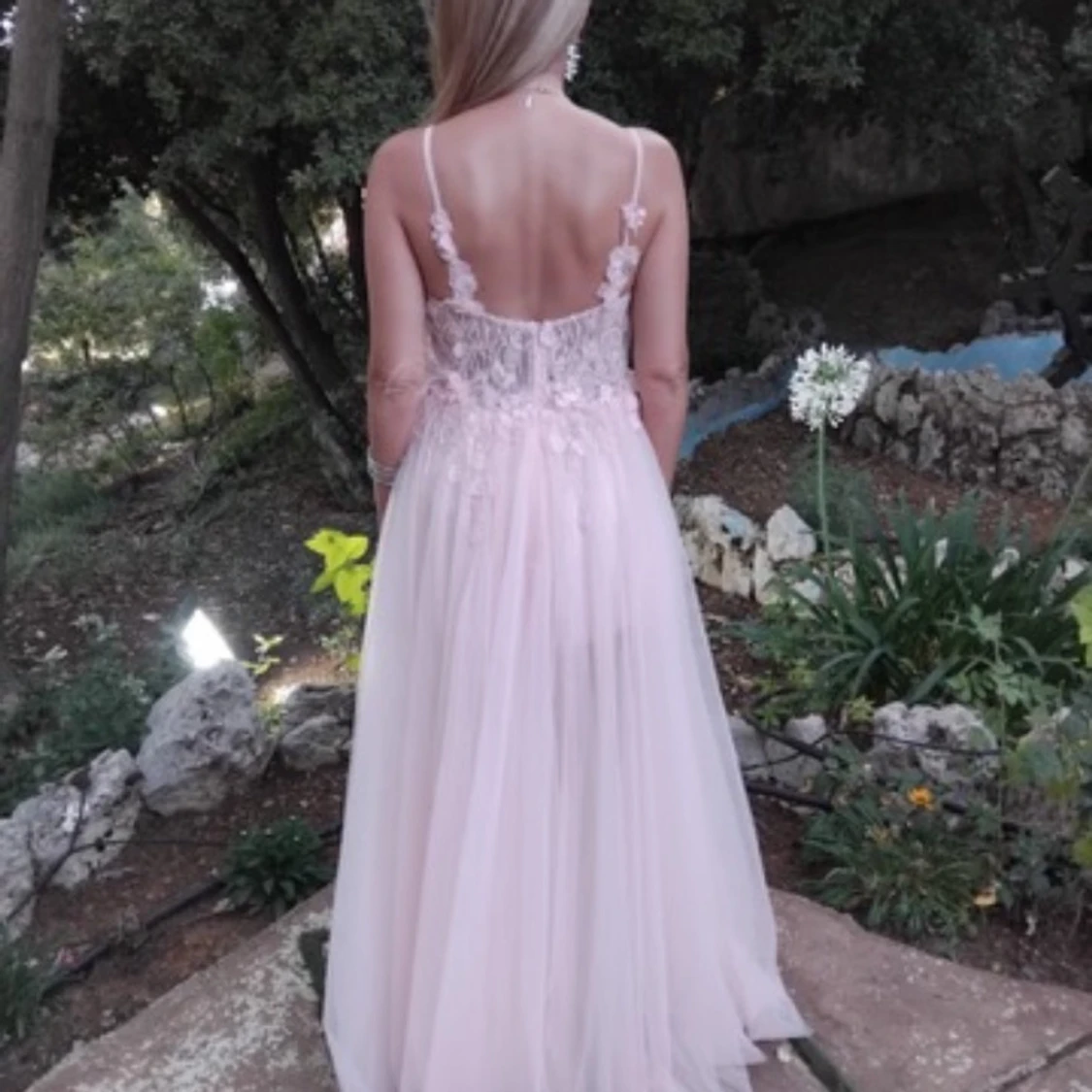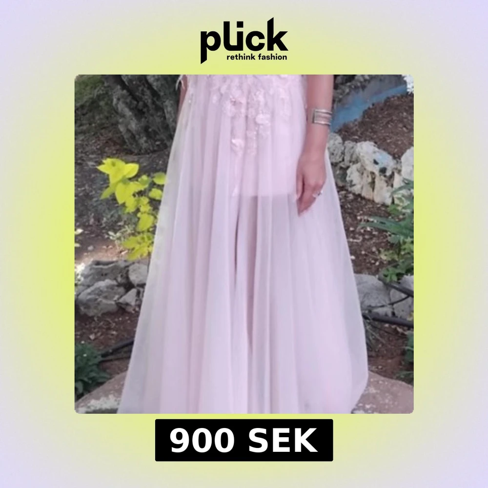 Superfin ljusrosa långklänning med tunna axelband och transparent, flowy kjol. Överdelen har vackra spets- och broderidetaljer samt 3D-blommor. Klänningen har slits framtill och öppen rygg, vilket ger en romantisk och elegant vibe. Perfekt för speciella tillfällen! Använd en kväll. Tvättad.