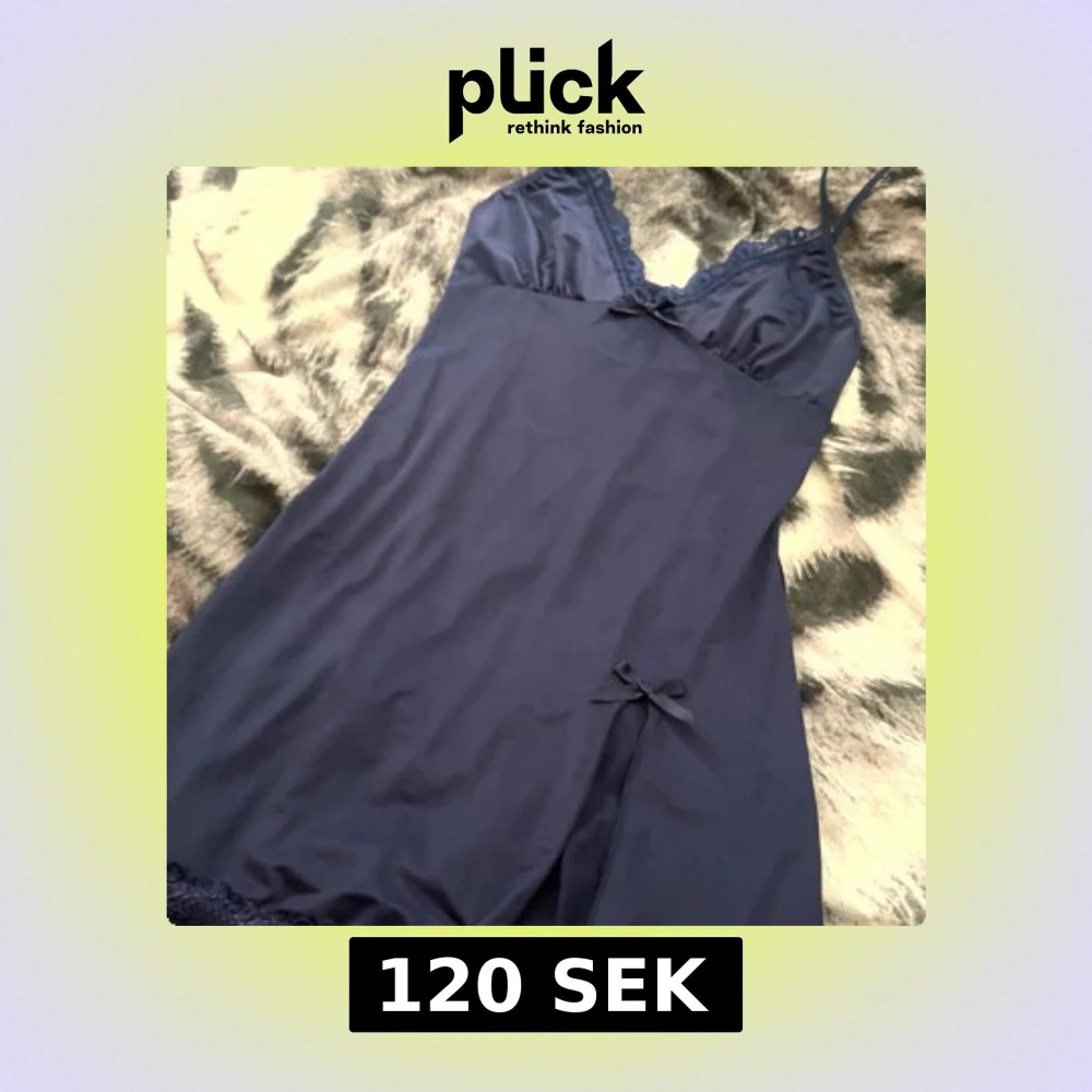 Mörkblå kort pyjamas klänning i satin med tunna axelband, spetskant vid urringningen och nertill samt små rosetter som detalj och en slits.