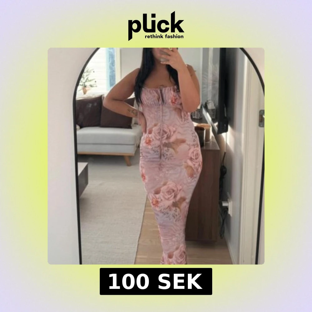 Supersnygg långklänning i ljusrosa med stora blommor och smala axelband. Klänningen har en tight passform och romantiskt blommönster, perfekt för dig som vill sticka ut. Materialet känns mjukt och följsamt mot kroppen.
