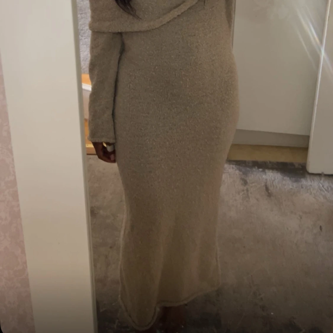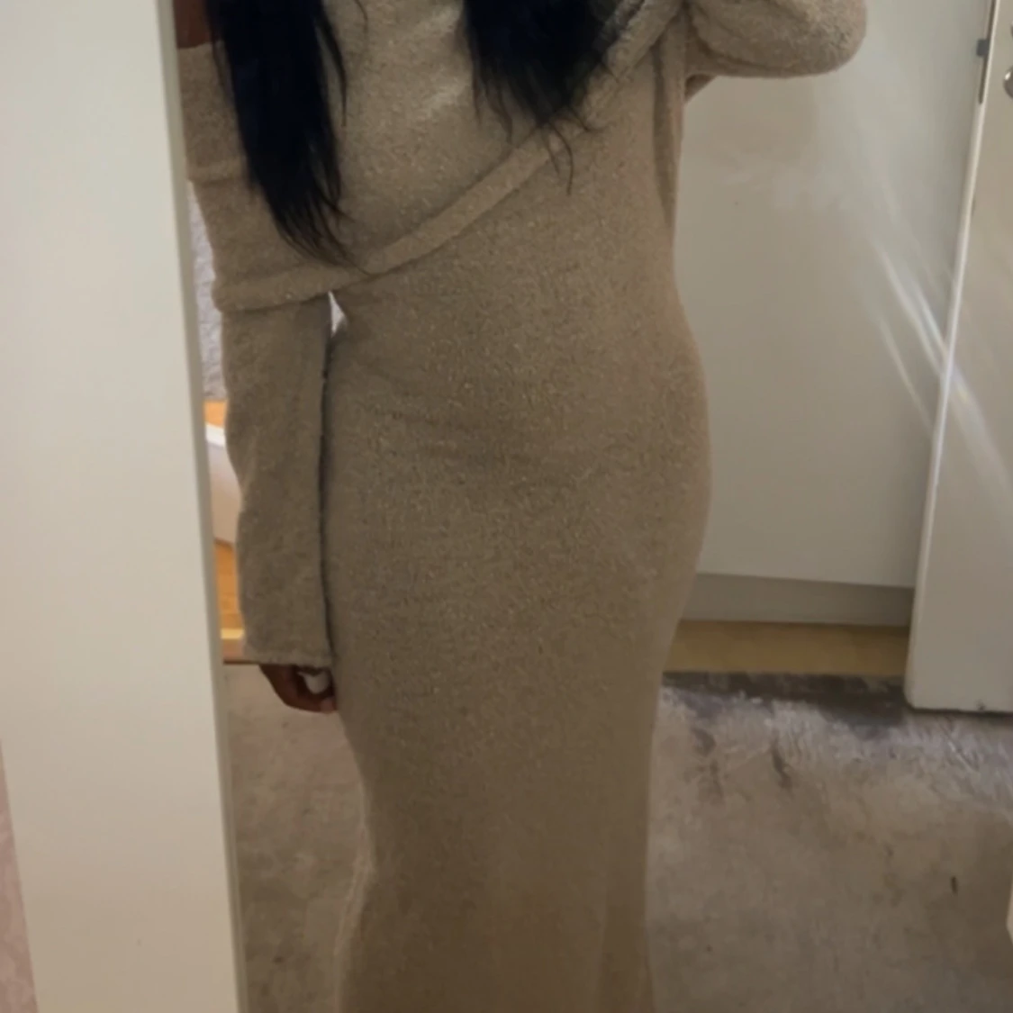 Snygg beige långklänning med offshoulder och långa ärmar. Helt oanvänd