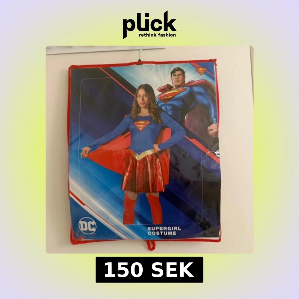 Supergirl klänning med blå överdel, rött och guldigt S-märke, glansig röd kjol och matchande cape. Ingår även röda och beige strumpbyxor. Perfekt för maskerad eller temafest!