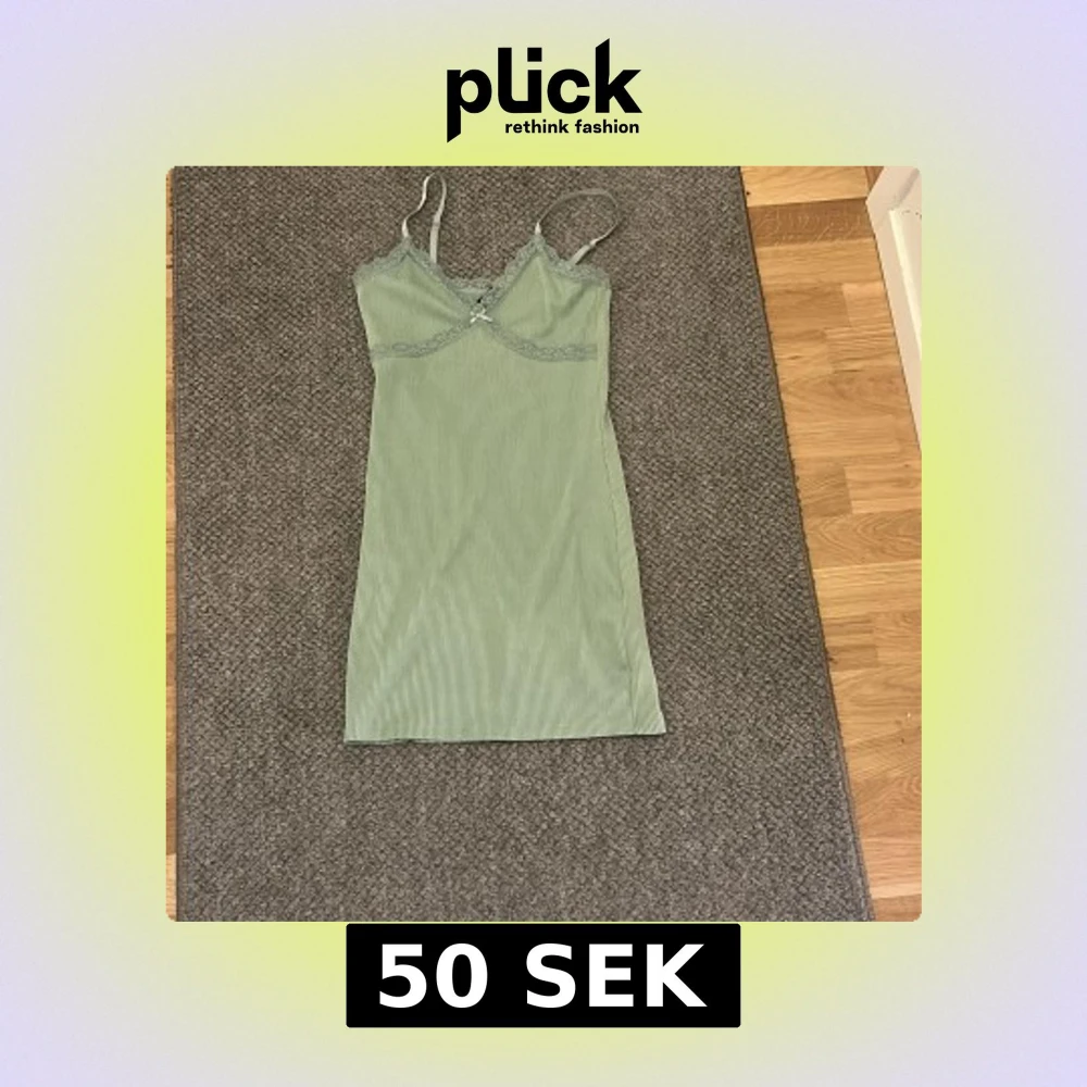 Supersöt ljusgrön ribbad klänning från H&M Divided i storlek S. Klänningen har spetsdetaljer vid bysten, smala axelband och en liten rosett framtill. Den är figurnära och har en kort längd, perfekt för dig som gillar en enkel men ändå gullig stil.