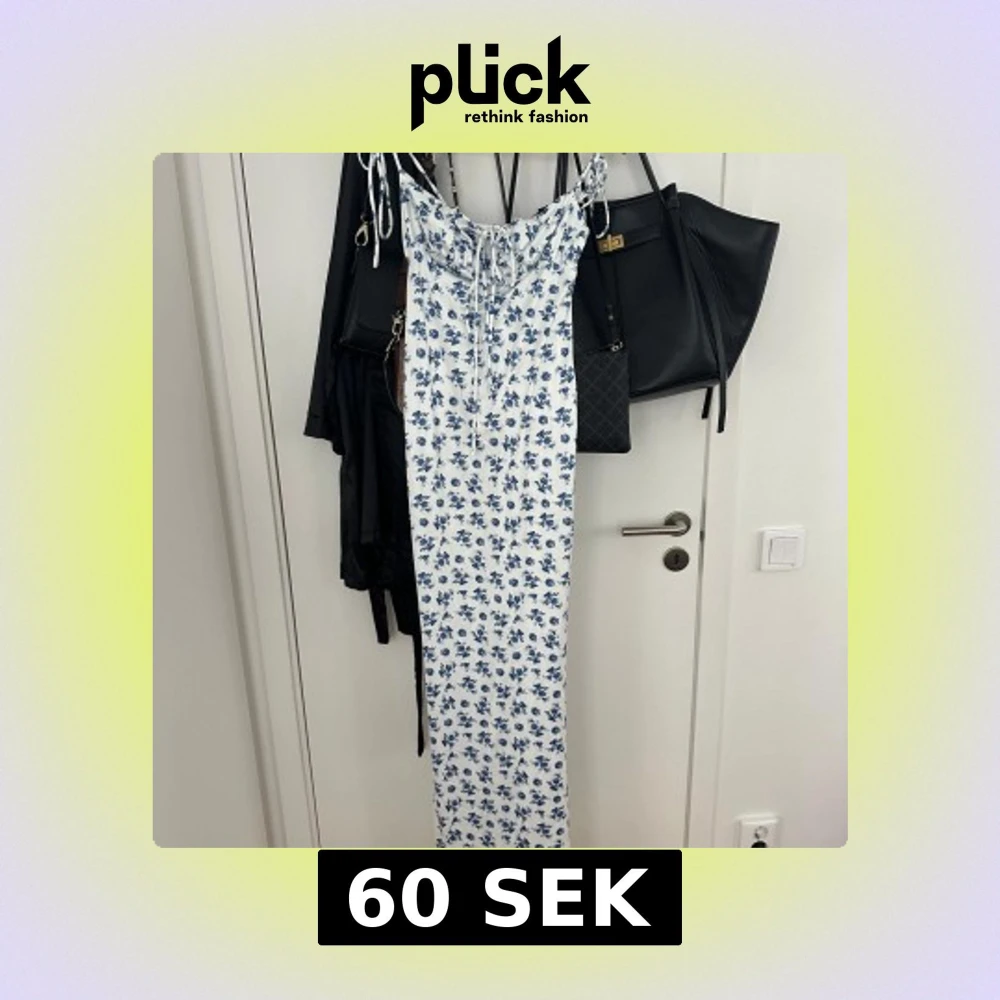 Supersöt långklänning i vitt med blått blommönster och smala axelband med knyt.