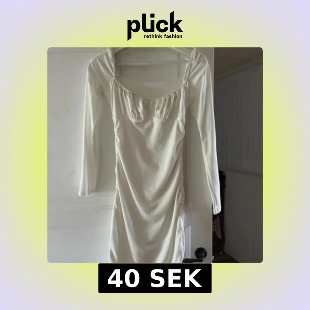 Säljer en stilren vit klänning med lång ärm och fyrkantig ringning. Klänningen har rynkade detaljer vid bysten och längs sidorna vilket ger en snygg passform. Perfekt för dig som gillar en enkel men trendig look. Är köpt i storlek S men passar även en som är i Xs, använd 1 gång