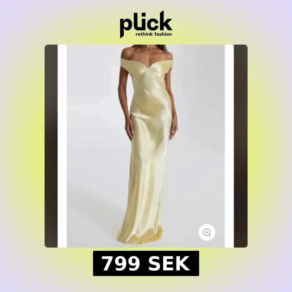 Elegant balklänning/långklänning i skimrande ljus gul satin med offshoulder-skärning och lätt v-ringad detalj framtill. Klänningen har figurnära passform och släpper mjukt längs kroppen för en lyxig känsla. Nypris 1148 kr