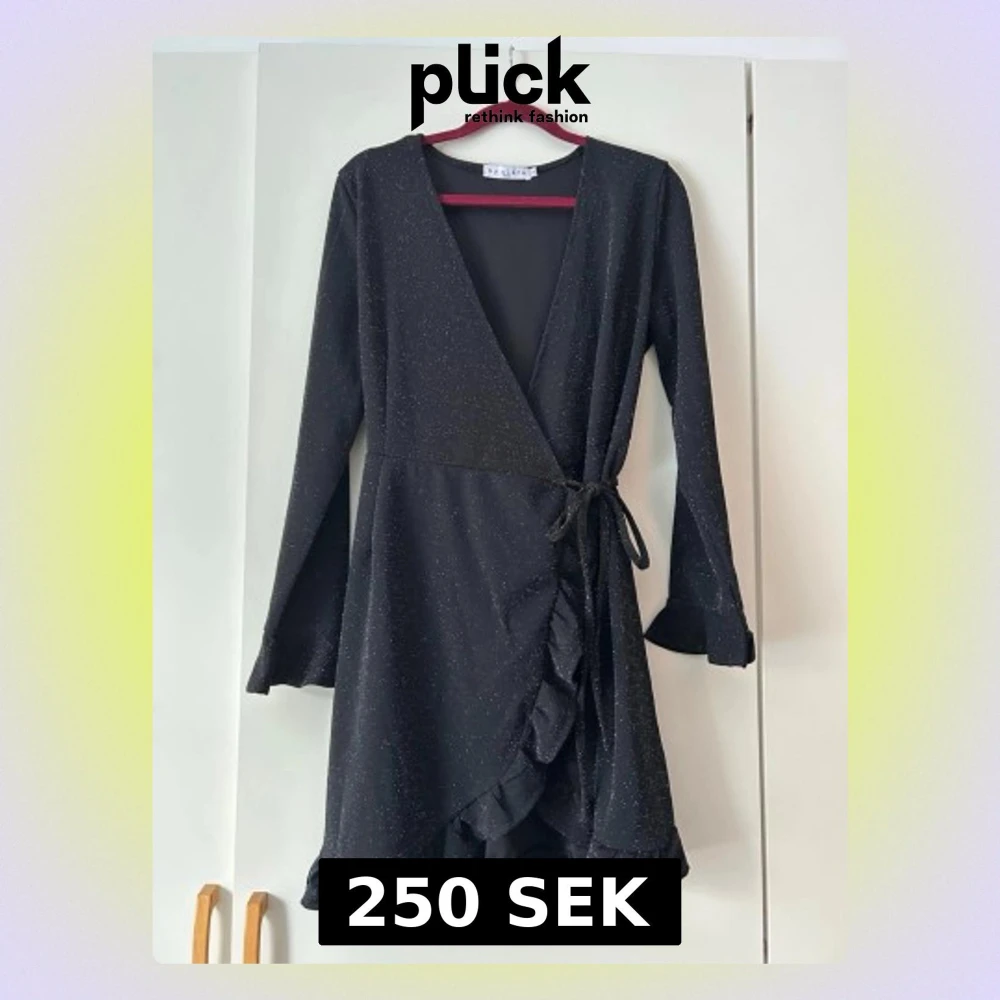 Svart omlottklänning från By Clara med långa ärmar och volangkant. Klänningen har ett subtilt glittrigt tyg och knyts i midjan för en snygg passform. Perfekt för dig som vill ha en chic look med lite extra shine.