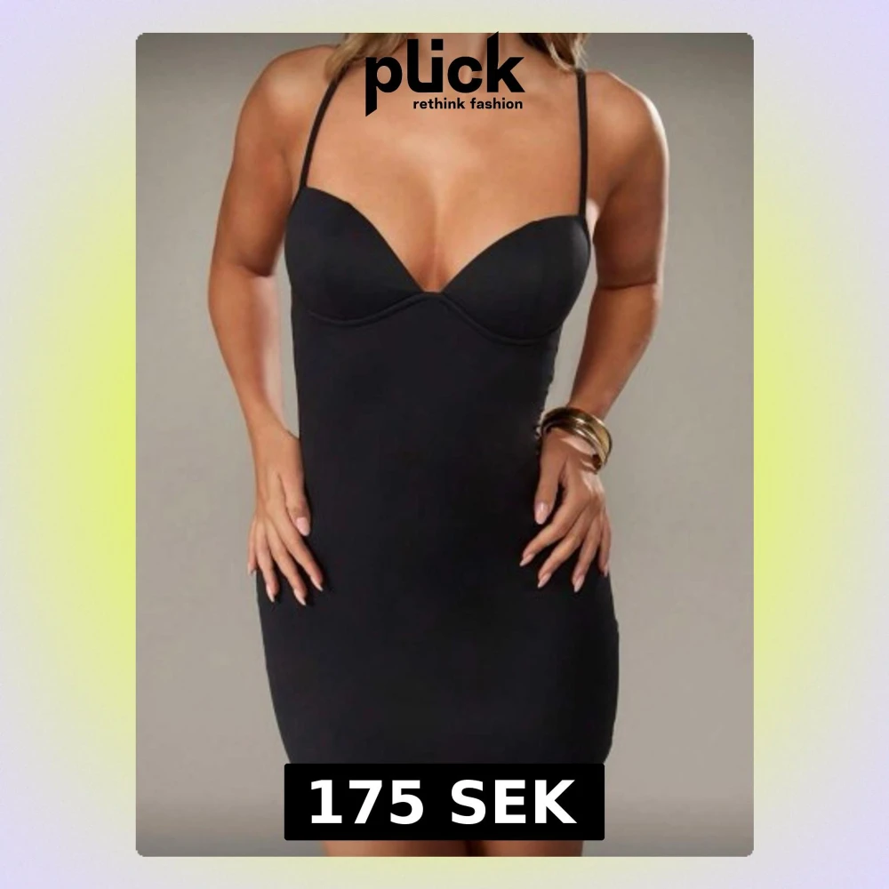 En svart, tight och kort klänning med smala axelband och djup v-ringning. Klänningen har en figurnära passform och ärmlös design som framhäver siluetten. Perfekt för dig som gillar en enkel och stilren look. Använd en gång