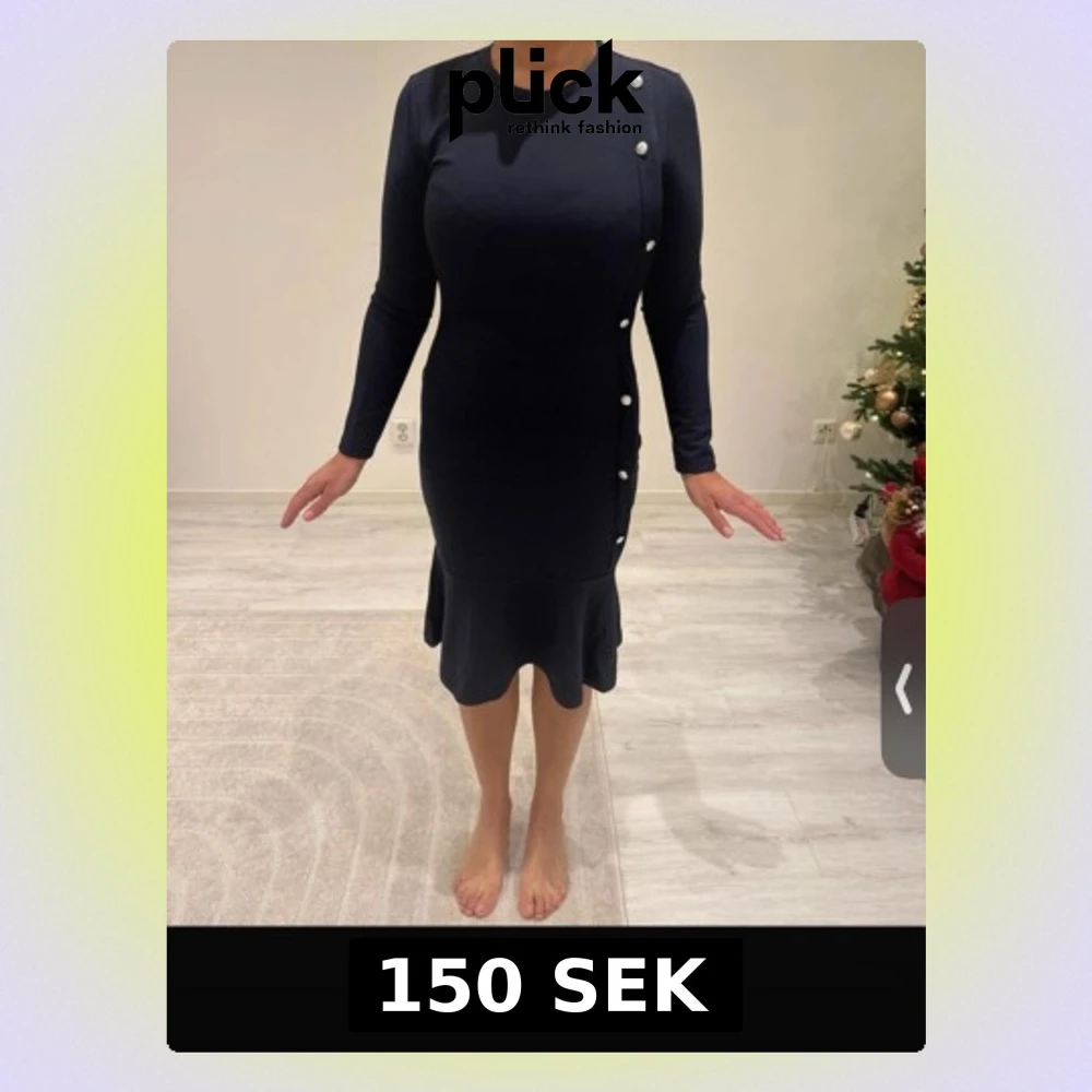 Snygg marinblå klänning i figurnära modell med långa ärmar och dekorativa vita knappar längs ena sidan. Klänningen har rund halsringning och volangkant nedtill som ger en extra touch. Perfekt för dig som gillar stilrena detaljer och en feminin siluett.