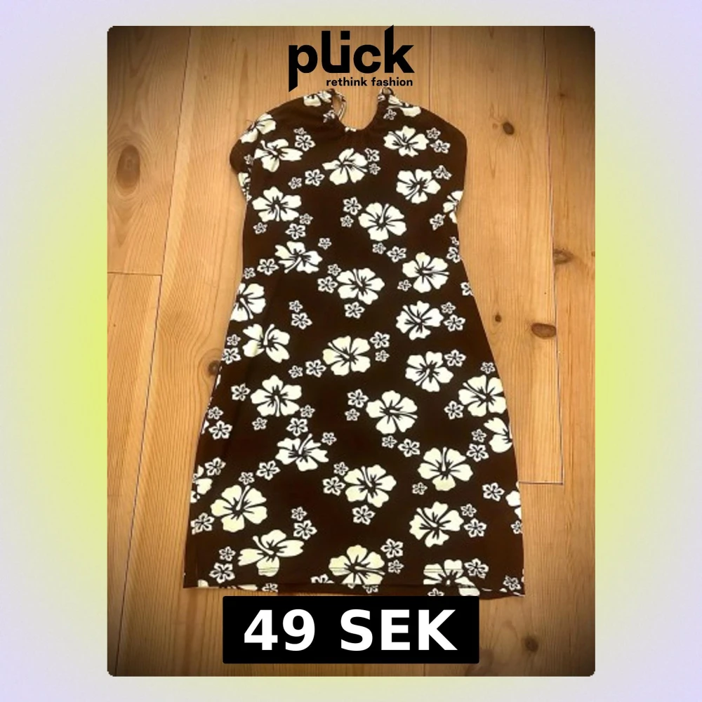 Säljer en brun halterneckklänning från H&M Divided i storlek S. Klänningen har ett vitt blommigt mönster och knytning i nacken. Den är kort och har en figurnära passform, perfekt för sommarens varma dagar.