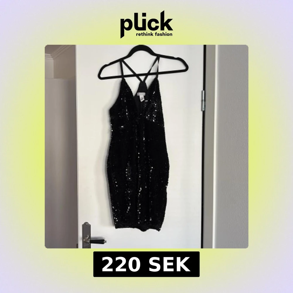 Snygg svart klänning från NLY One med glittrande paljetter och smala axelband. Perfekt för en kväll ute! Klänningen har en v-ringad design och är kort i modellen.