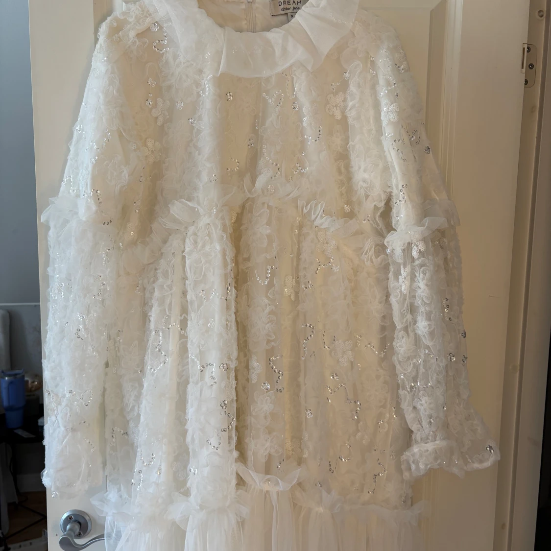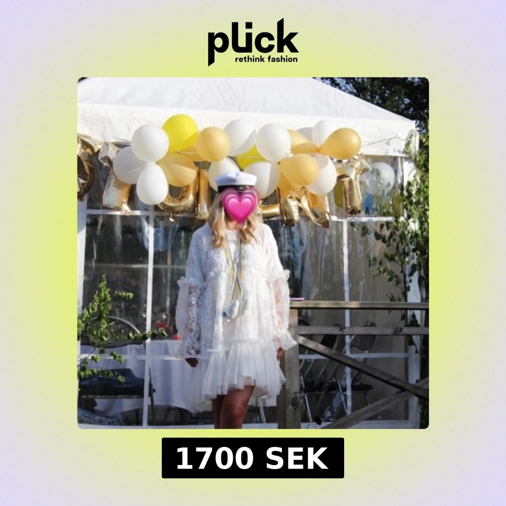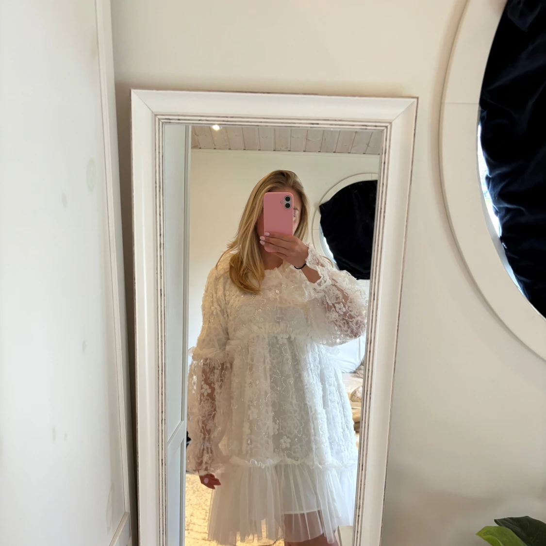 Superfin vit klänning med spets och glittriga detaljer från Sister Jane. Klänningen har lång ärm, volanger och en luftig passform. Perfekt till student, jätte fint skick bara använd en gång på min student. Den är slut överallt, nypris 2700