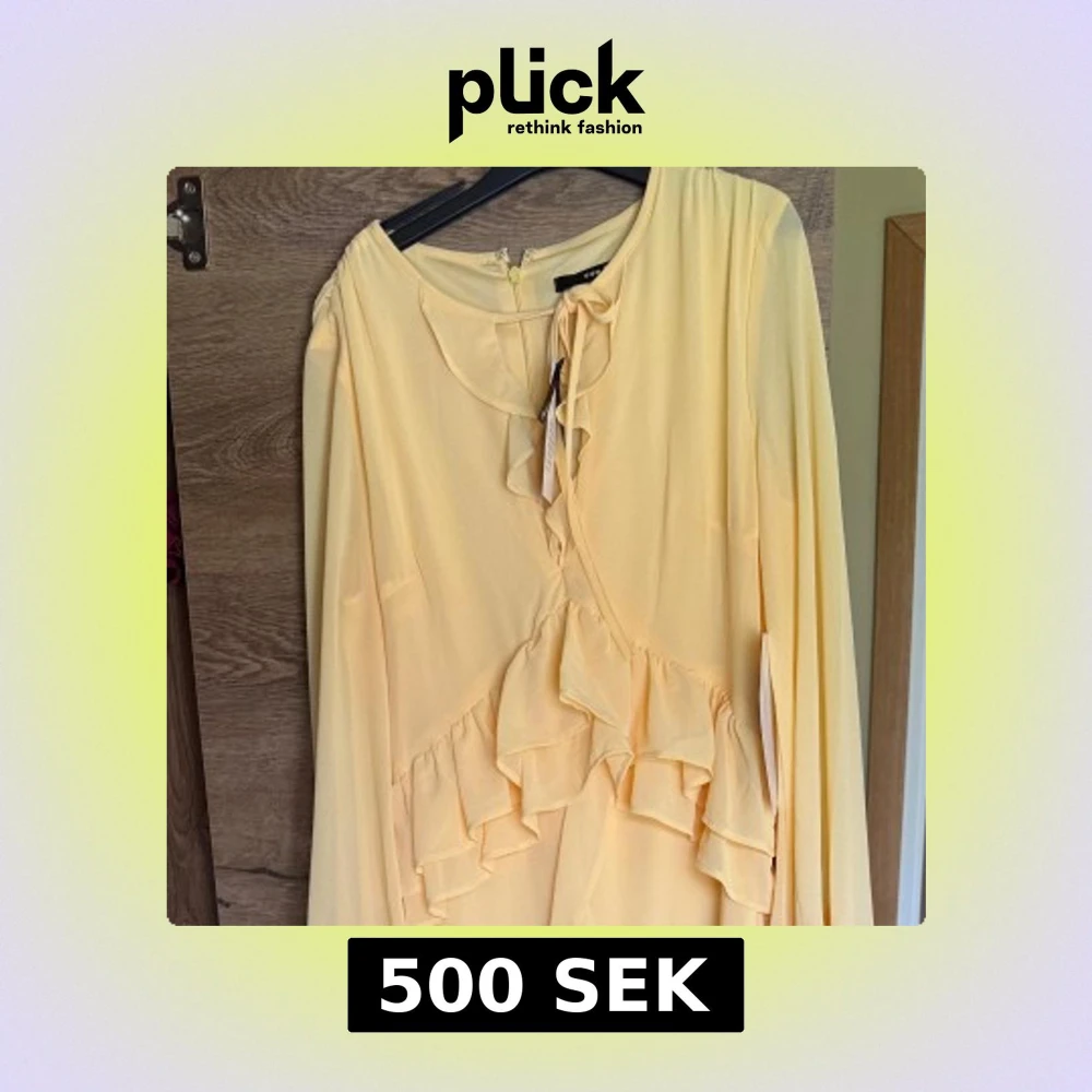 Supersöt ljusgul omlottklänning från Asos med långa ärmar och volangdetaljer framtill. Klänningen har en feminin v-ringning och knyt i halsen. Perfekt för dig som gillar romantisk och trendig stil.