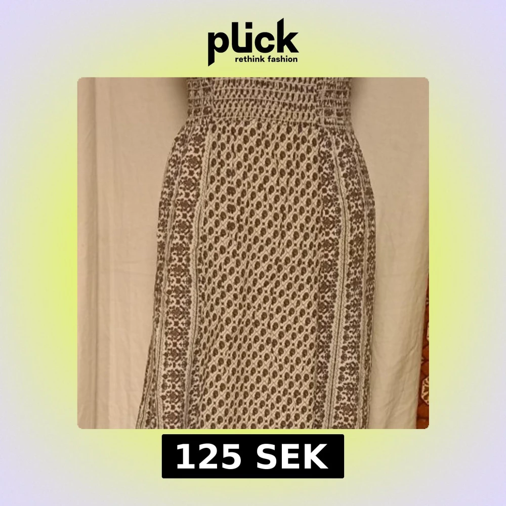 Säljer en mönstrad klänning i viskos med ett brunt och beige mönster. Klänningen har en smockad överdel och faller fint ner till en lång längd. Perfekt för en bohemisk look.