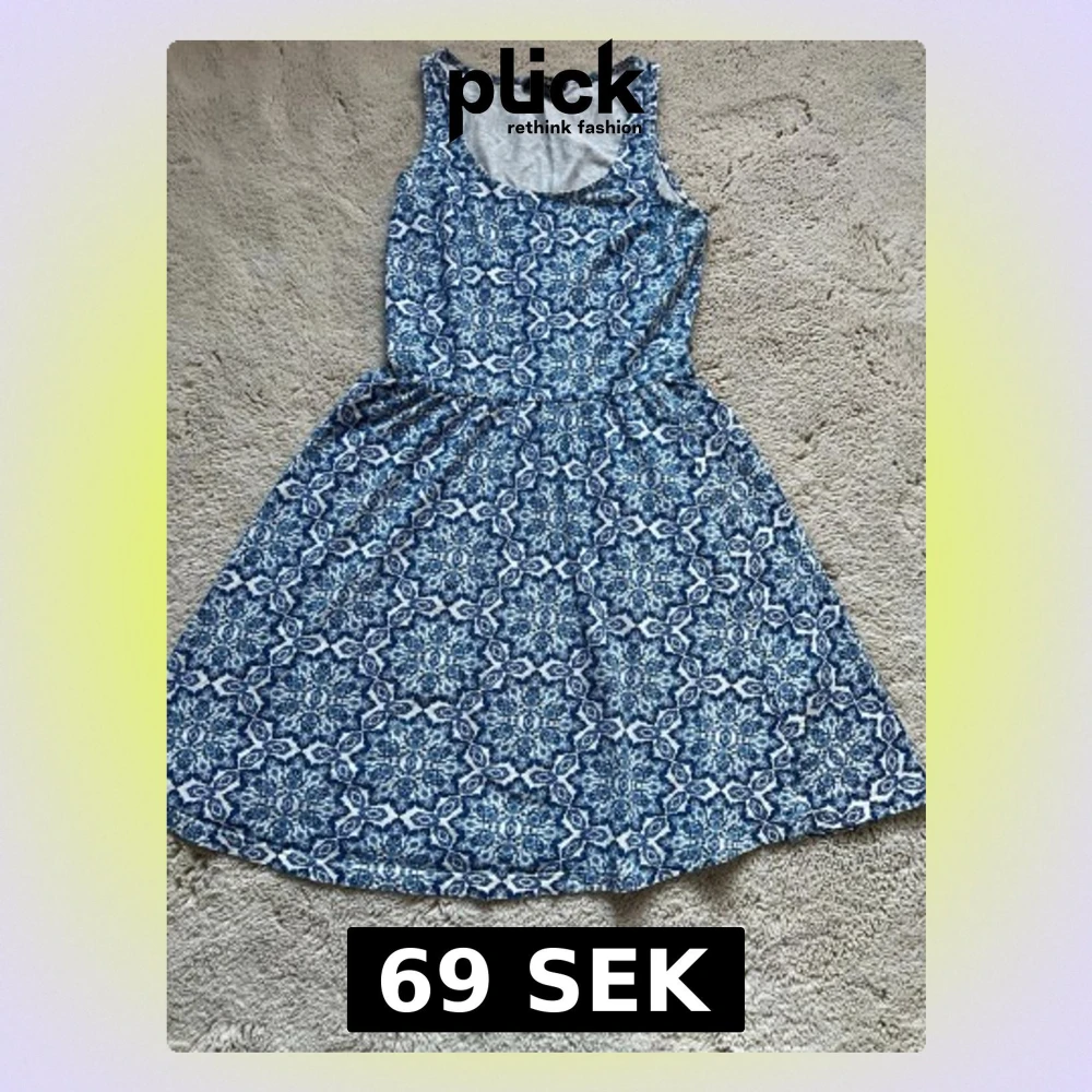 Säljer en blåvit kortklänning med ett snyggt geometriskt mönster. Klänningen är ärmlös och har rund halsringning. Passar perfekt om du ska åka utomlands. Passar personer som är Xs-M