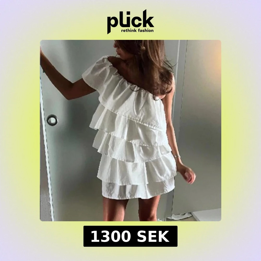 Intressekoll på denna fina vit kortklänning med flera volanglager och one shoulder-design. Klänningen har en luftig och lekfull stil, perfekt för varma dagar eller speciella tillfällen. Den är axelbandslös på ena sidan och har en snygg, asymmetrisk form.