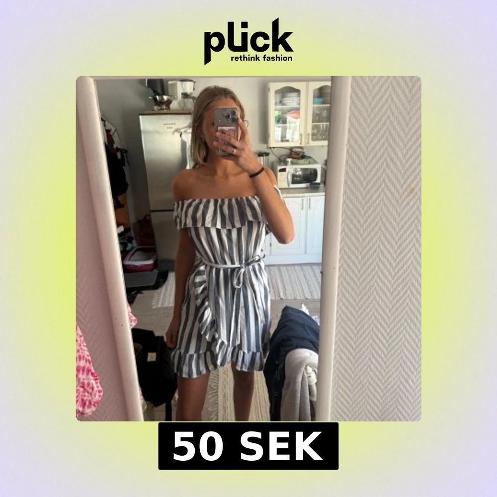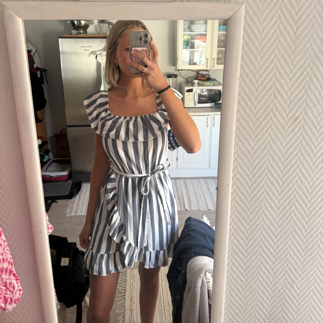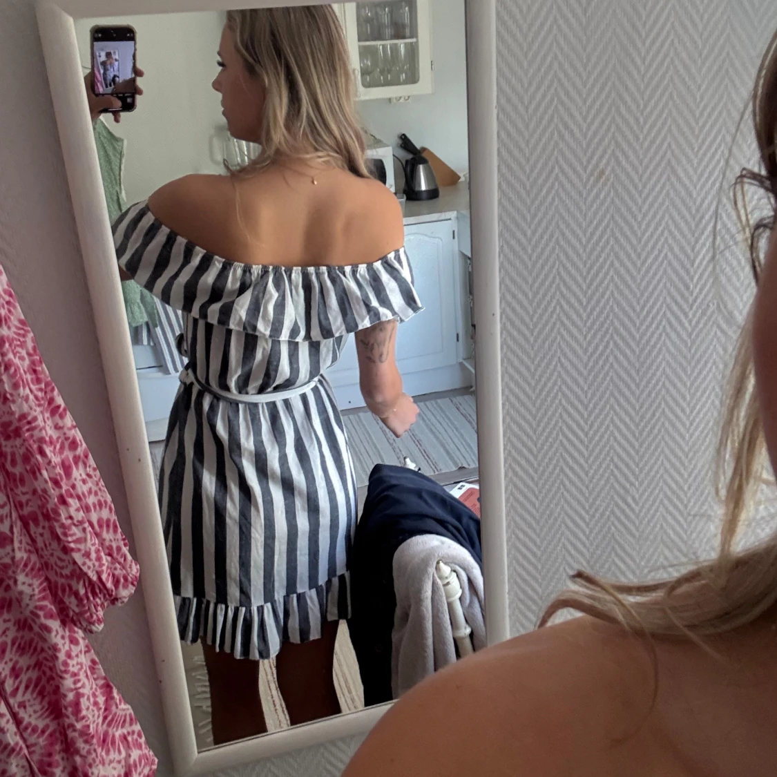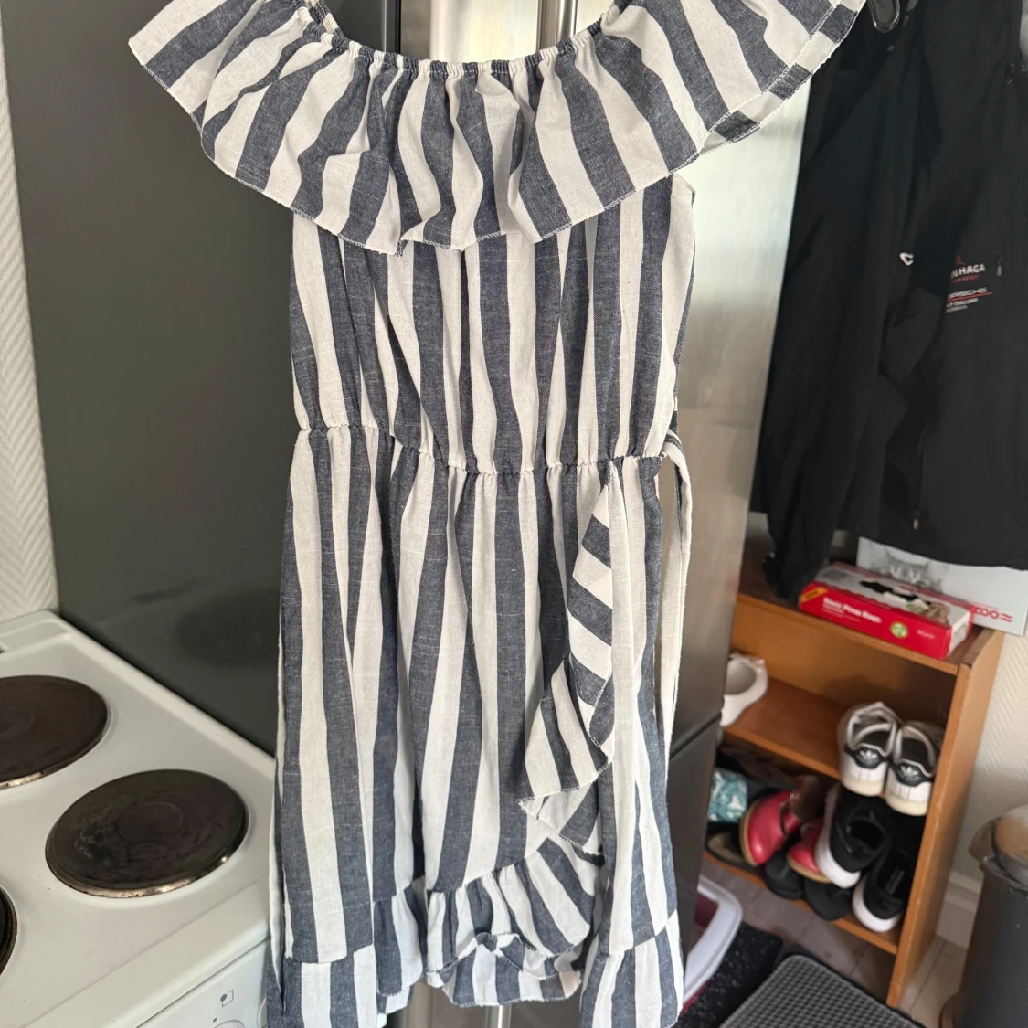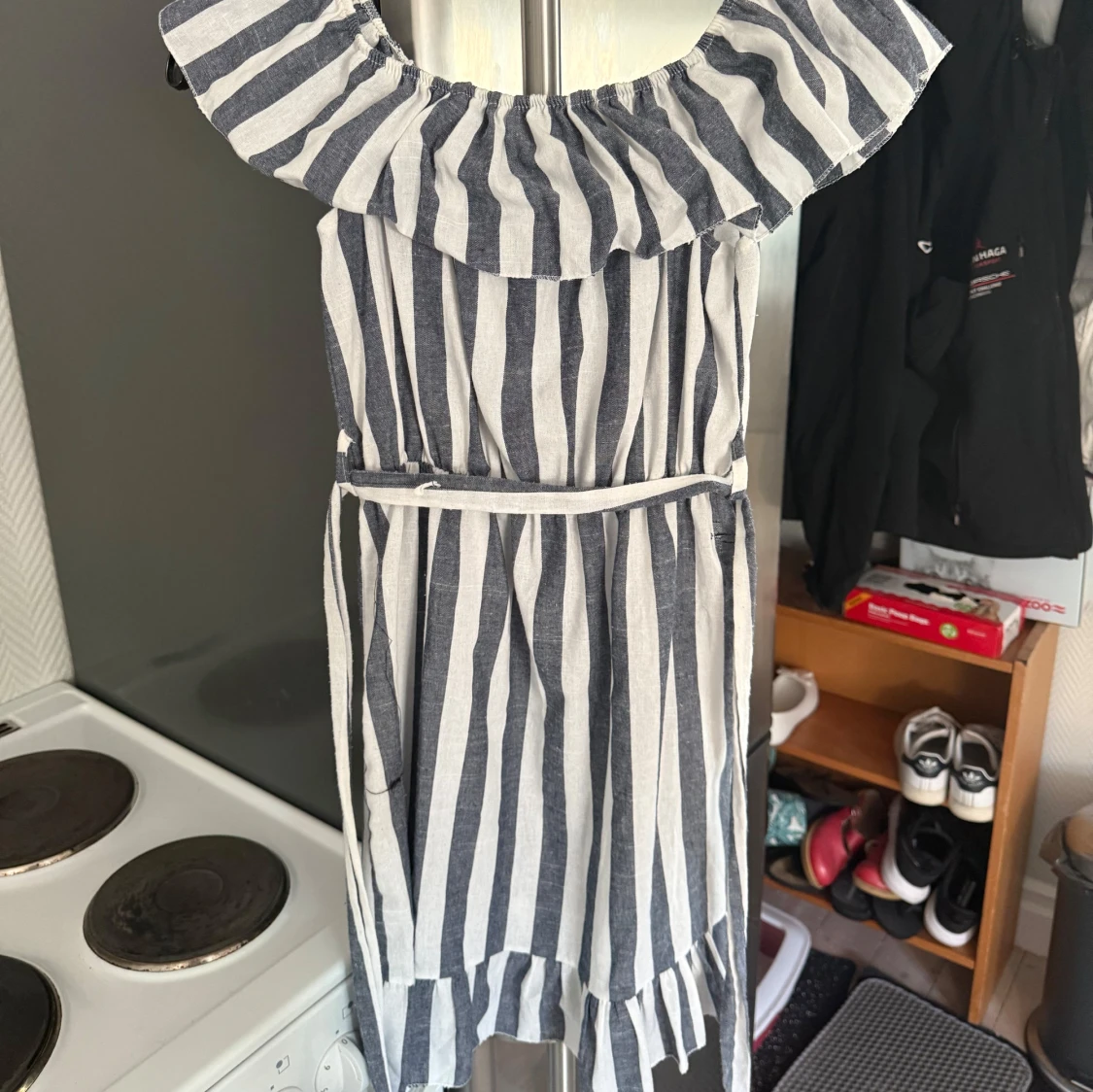Jätte fin och söt randig klänning. Köpt i Kroatien och använd 3/4 gånger max. Kan användas både off shoulder och som vanligt.