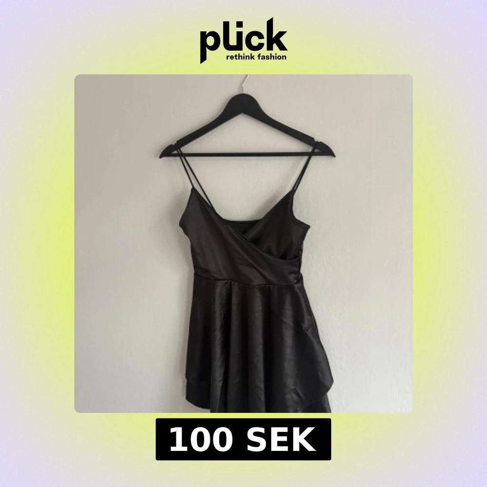 Supersnygg svart kortklänning i satin med omlottliv och tunna axelband. Klänningen har en lätt glansig finish och en flowy kjol som ger en elegant vibe. Perfekt för dig som gillar minimalistisk stil med en touch av lyx.