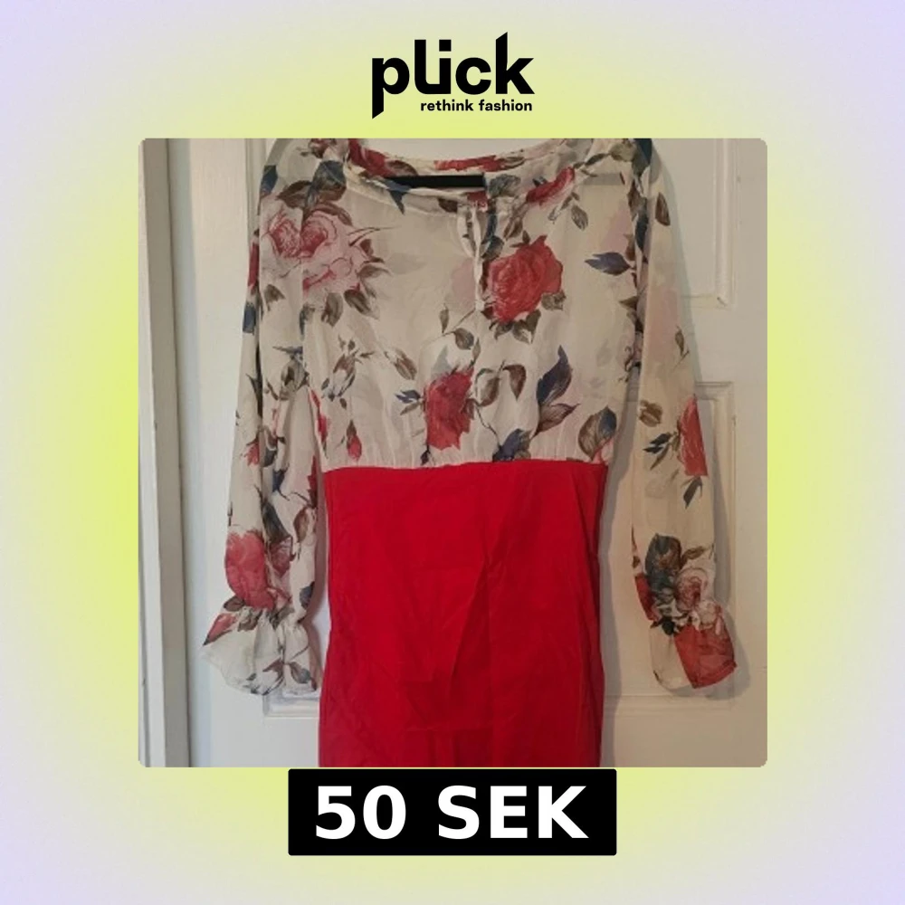 Snygg långklänning med blommigt mönster upptill i rött, blått och grönt på vit botten och enfärgad röd nederdel. Långa ärmar med lätt volang vid ärmslut och rund halsringning. Perfekt för dig som vill sticka ut med färg och mönster.