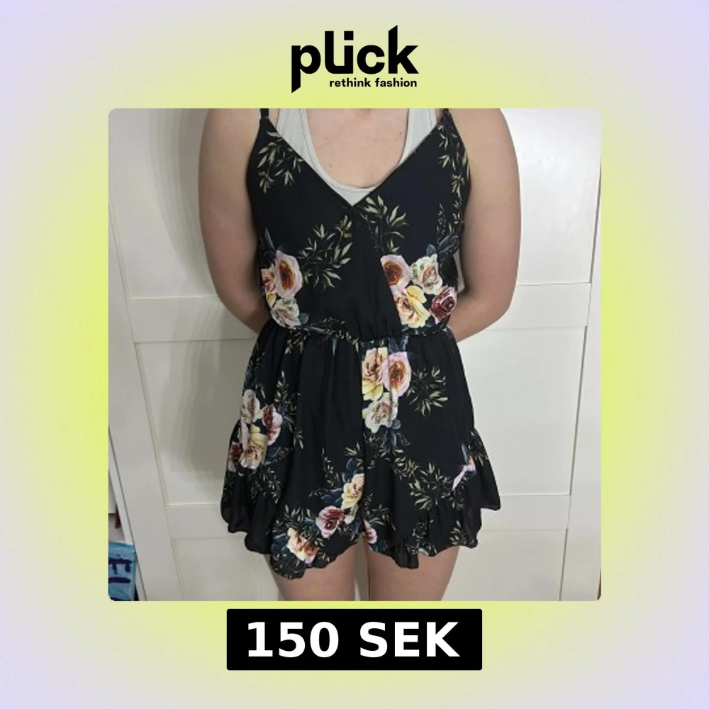 Säljer en svart jumpsuit med vackert blommönster i rosa och grönt. Den har smala axelband och en v-ringad design. Perfekt för sommarens varma dagar!