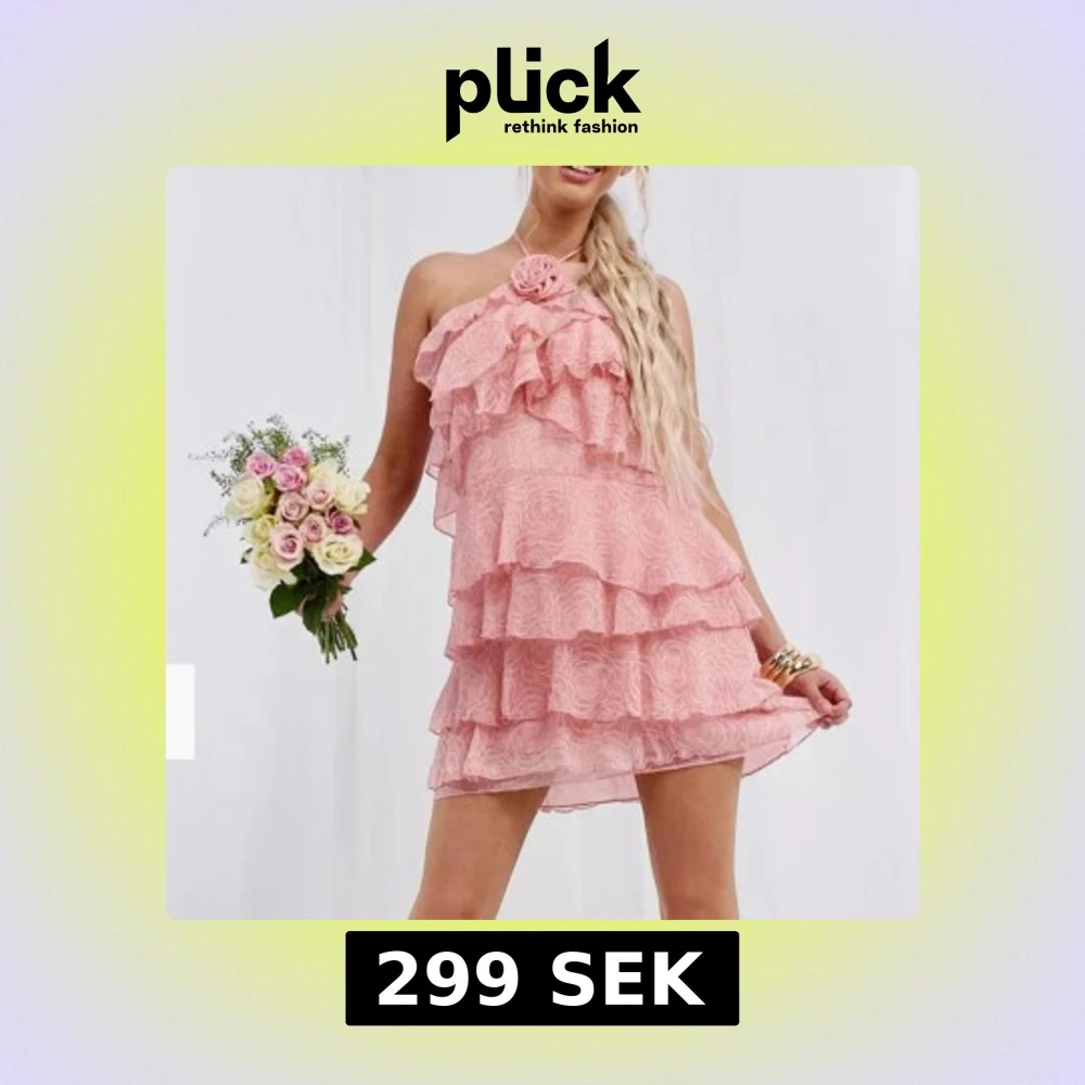 Charmig rosa axelbandslös klänning med flera lager av volanger och en dekorativ blomma vid halsen. Perfekt för somriga tillfällen med sin luftiga och lekfulla design. Den är helt oanvänd!! Pris lappen sitter kvar