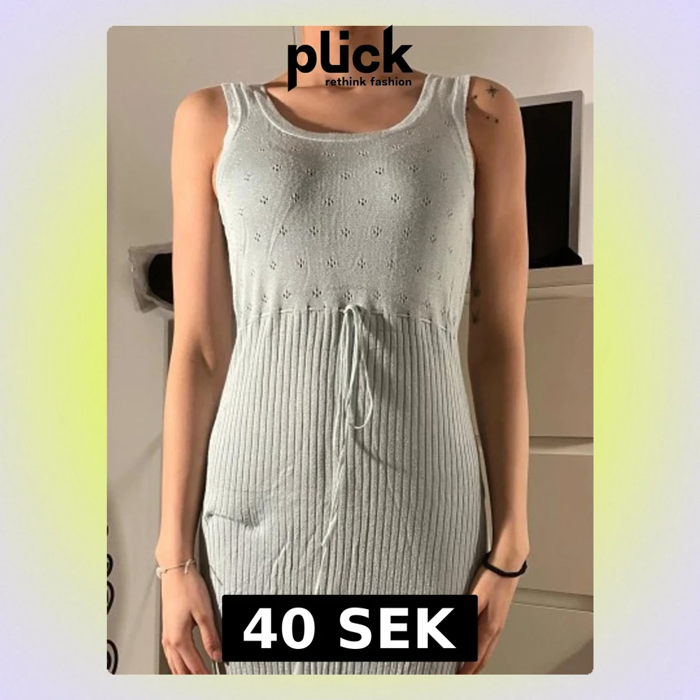 Säljer en ljusgrå, ärmlös klänning med ribbad nederdel och små hålmönster upptill. Klänningen har snörning i midjan för justerbar passform och är i mjukt stickat material. Perfekt för en avslappnad och stilren look.