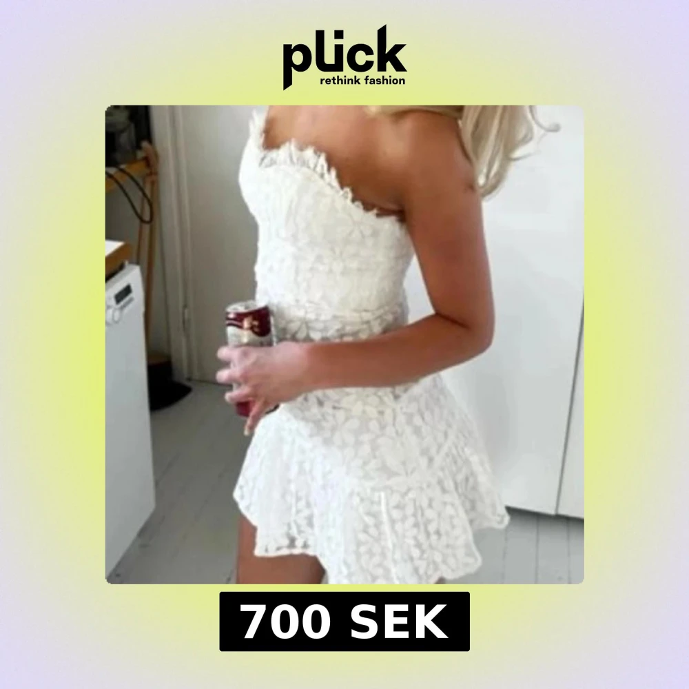 Säljer en söt vit kortklänning med blommigt mönster och volang nertill. Klänningen har en figurnära passform med fina spetsdetaljer upptill. Perfekt för sommarens alla tillfällen!