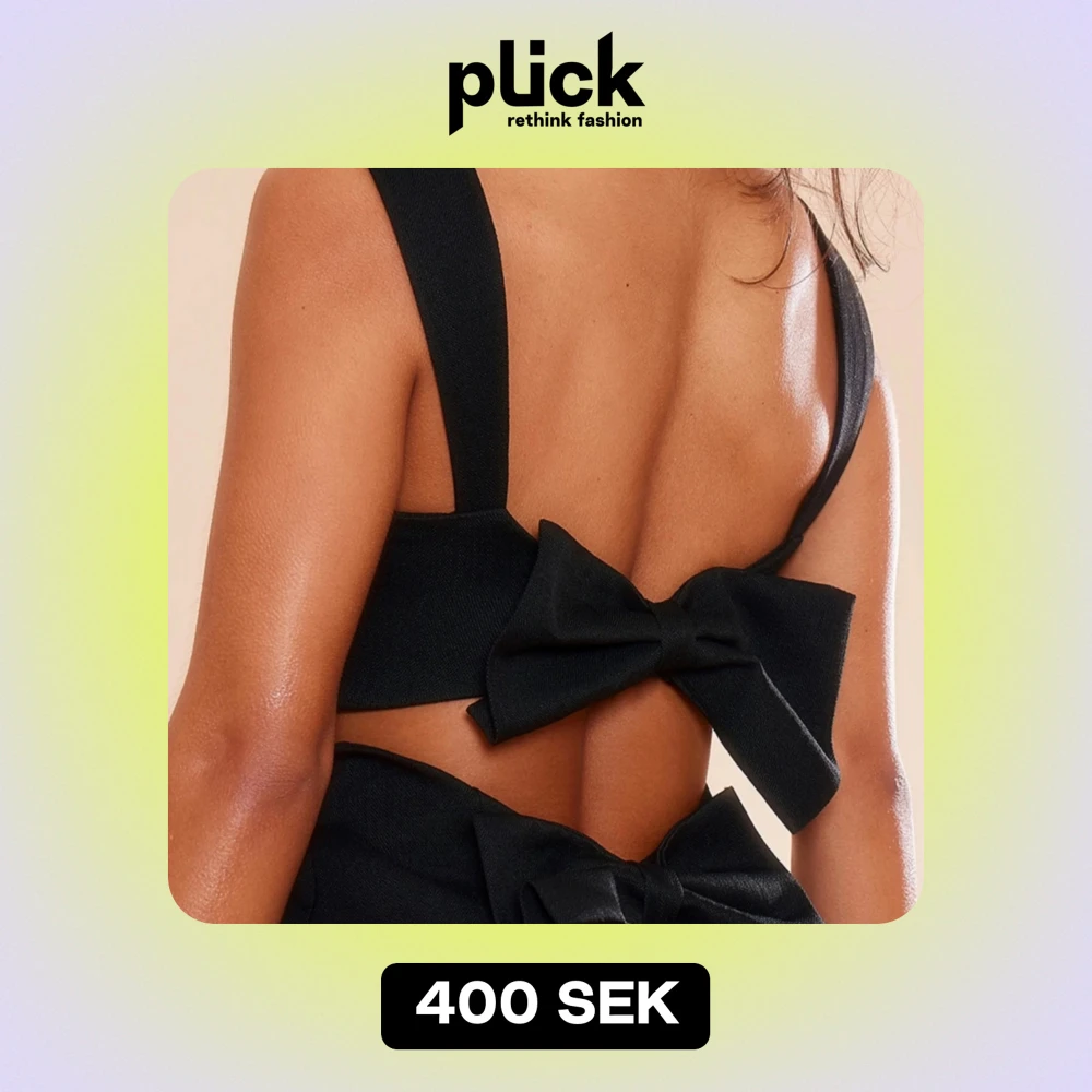 Snygg svart klänning med en tight passform och stora rosetter på ryggen. Den är ärmlös och har en öppen rygg vilket gör den perfekt för festliga tillfällen. Klänningen är kort och ger en elegant look.