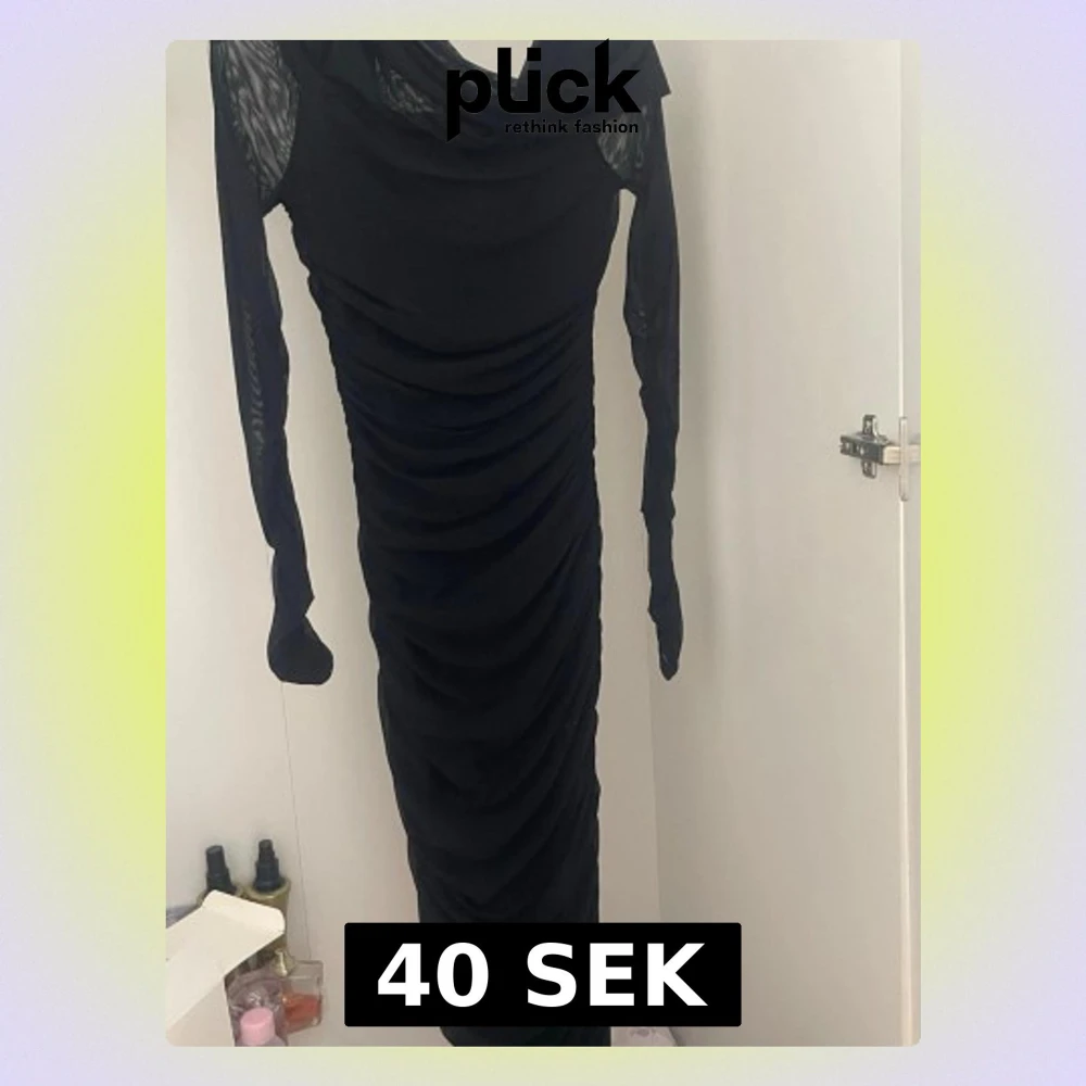 Snygg svart långklänning med draperade detaljer och transparenta långärmar. Klänningen har en cool omlottkrage och är figurnära med ett elegant fall. Perfekt för dig som gillar stilrena och trendiga plagg med lite edge.