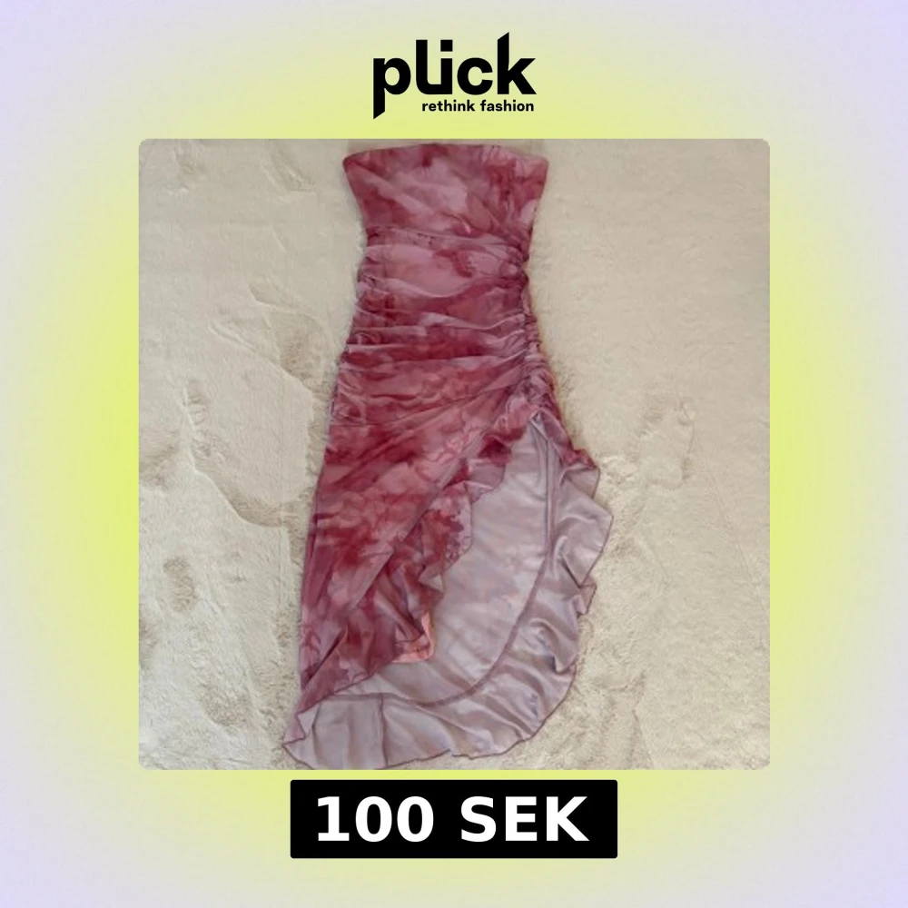 Snygg strapless klänning i rosa med blommigt mönster och volang detaljer. Aldrig använd, nypris 179kr