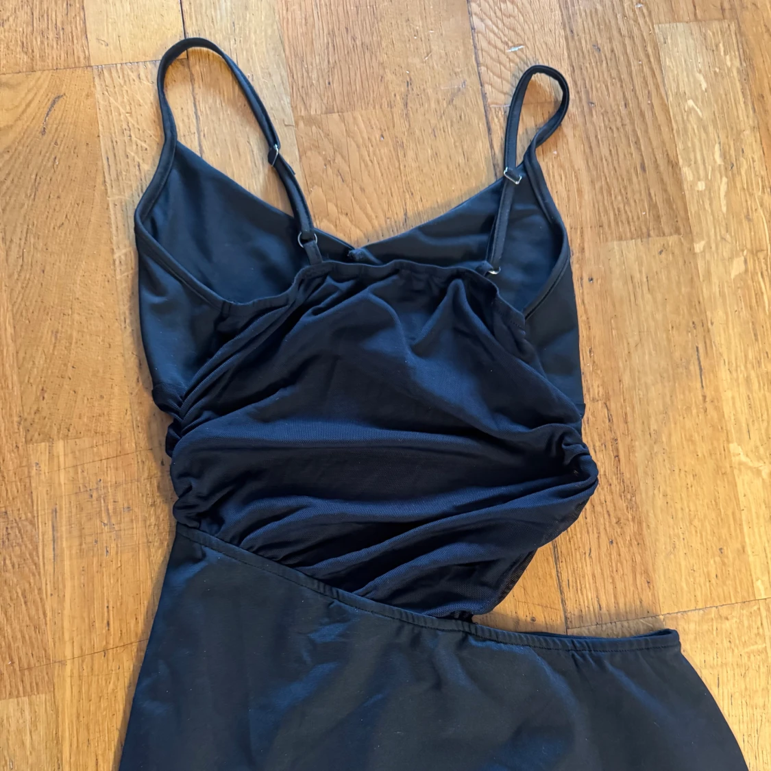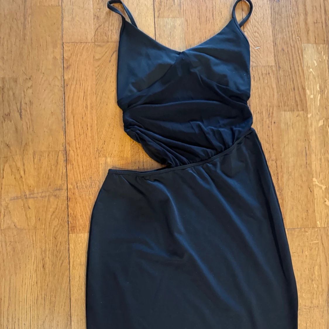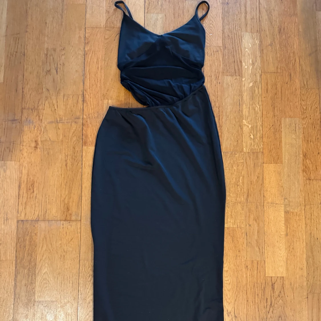 Stilren svart långklänning med smala justerbara axelband och v-ringad överdel. Klänningen har en figurnära passform och är tillverkad i ett mjukt, stretchigt material. Snygg drapering över bysten och midjan ger en modern look.
