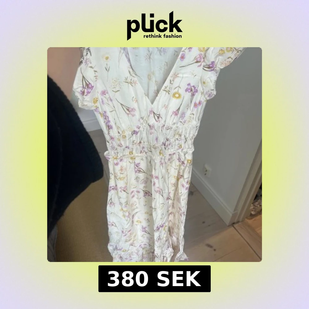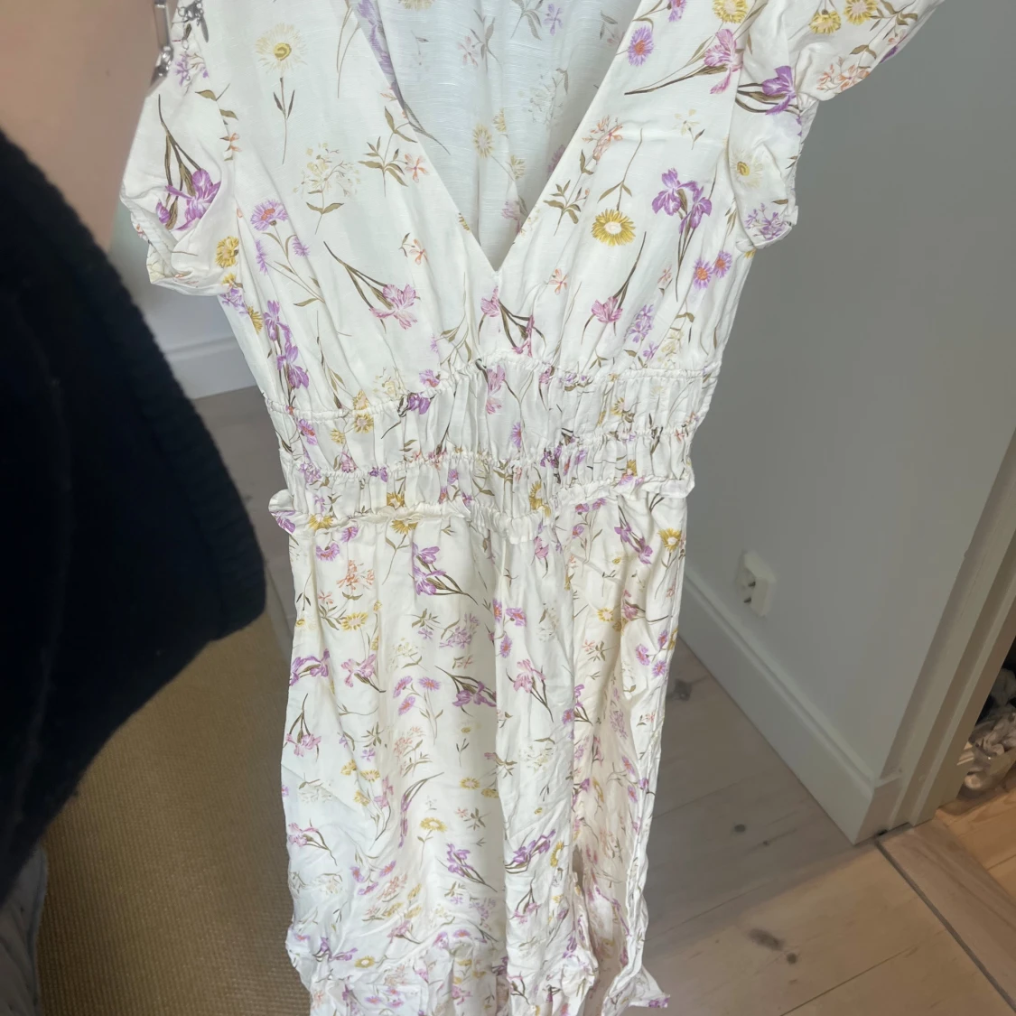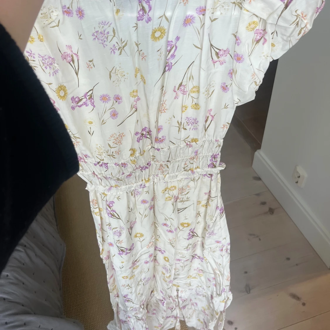 Superfin vit klänning med blommigt mönster i lila och gult. Klänningen har v-ringad hals, korta ärmar och smock i midjan för en snygg passform. Perfekt för sommarens alla tillfällen och har en lätt och luftig känsla.