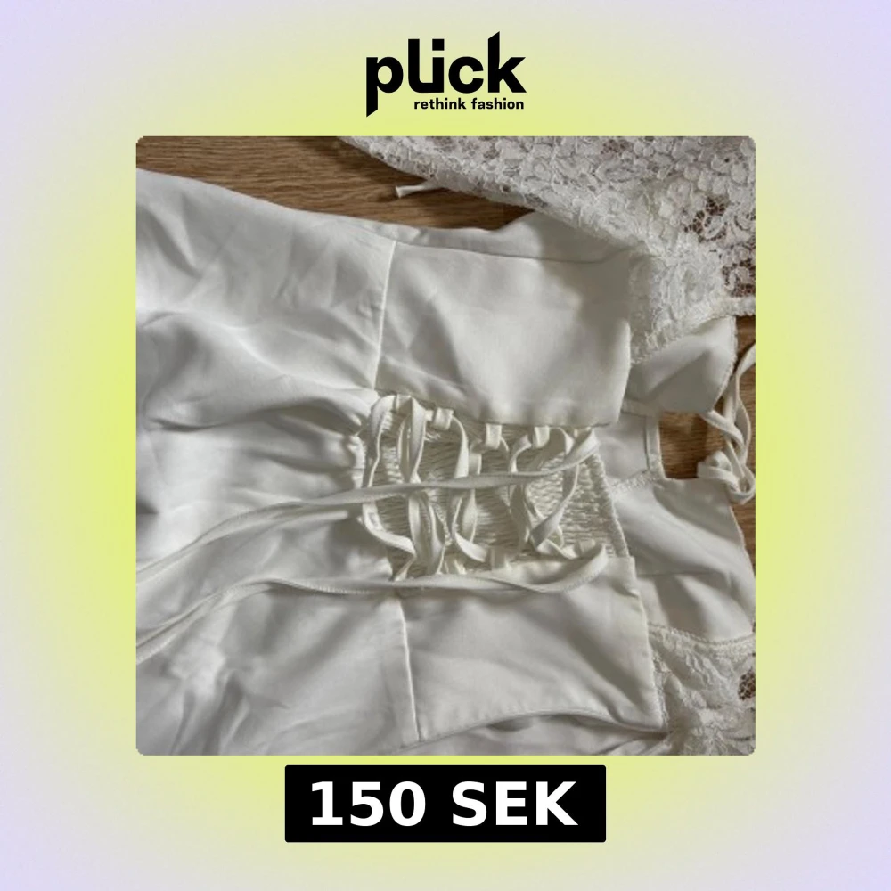 Elegant vit klänning med långa spetsärmar och snörning i ryggen. Klänningen har en vacker spetsdetalj vid halsen och en figurnära passform. Perfekt för speciella tillfällen.