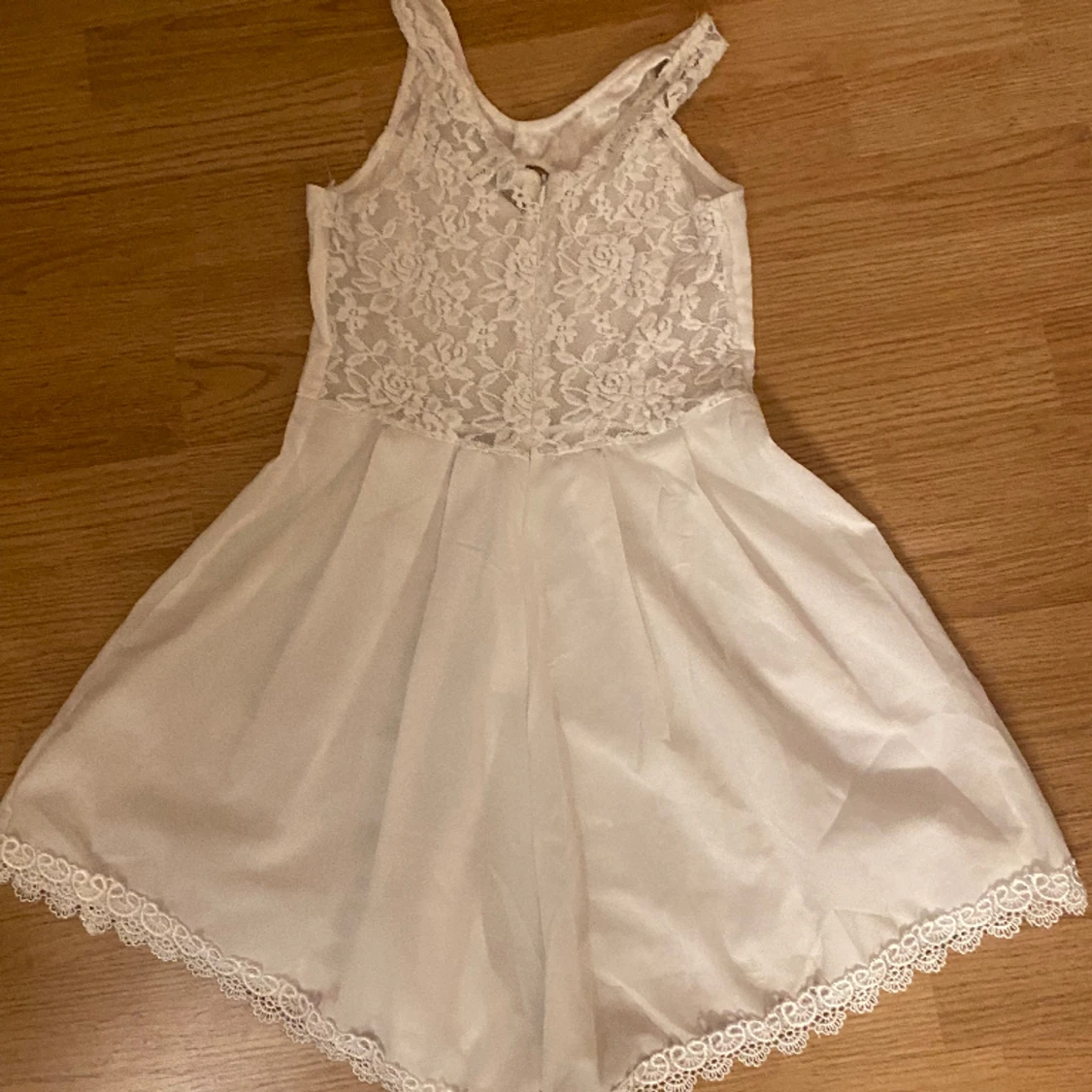Vit jumpsuit storlek s men sitter som xs, den är använd fåtal gånger så inga fel på den. Ser mer ut som en klänning när den sitter på