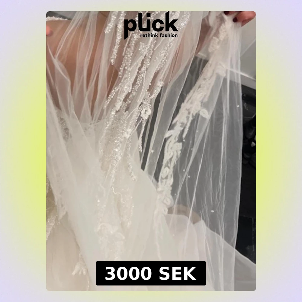 Elegant vit brudslöja i tunn tyll med detaljerat pärlbroderi och spetsapplikationer. Slöjan har ett långt släp och skimrande inslag som ger en lyxig känsla. Perfekt för dig som vill ha något extra till bröllopslooken. Egendesignad, 3,5 m