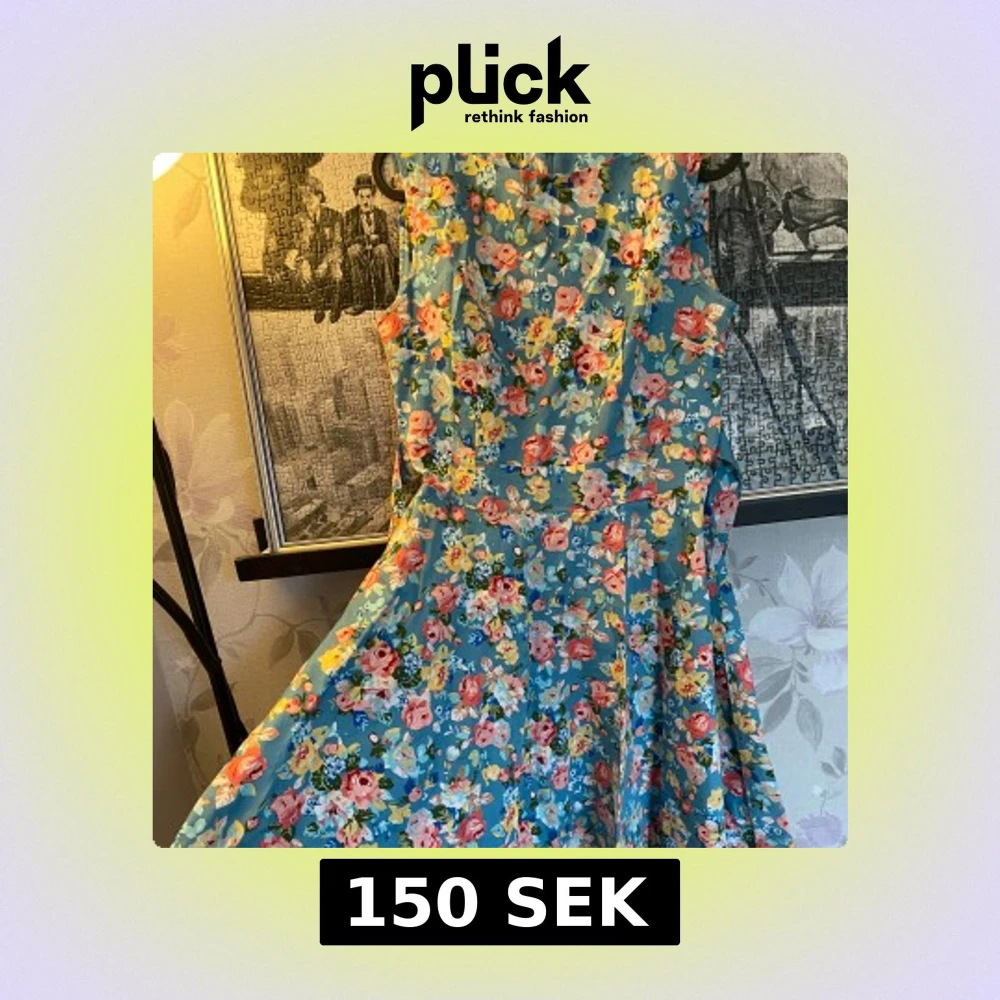 Charmig blå klänning med ett färgglatt blommönster. Den har en ärmlös design och en vacker passform som ger en feminin siluett. Perfekt för somriga dagar.