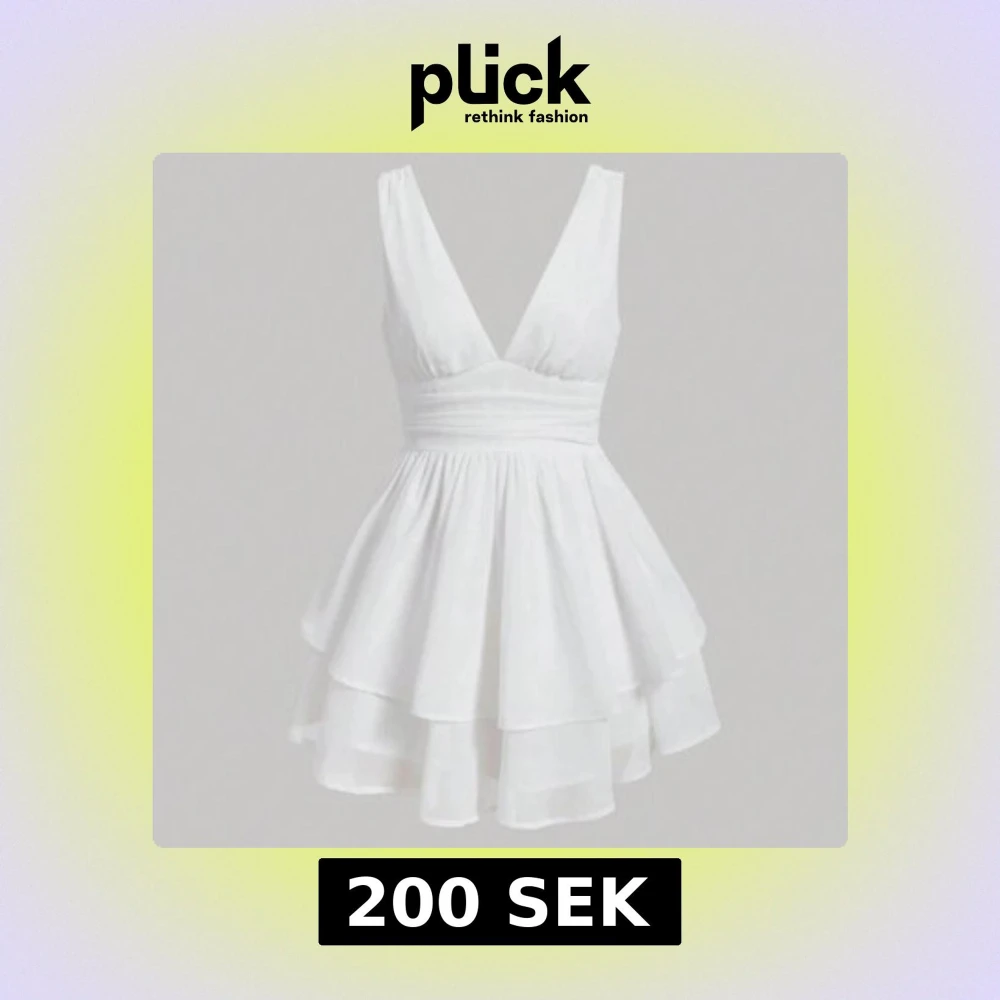Säljer en söt vit kortklänning med volanger och v-ringad design. Perfekt för studenten/ eller en fin sommardag. Klänningen har en omlott-look och är ärmlös för en luftig känsla. Den är helt ny och säljer den pga att jag inte kunde lämna tillbaka den.