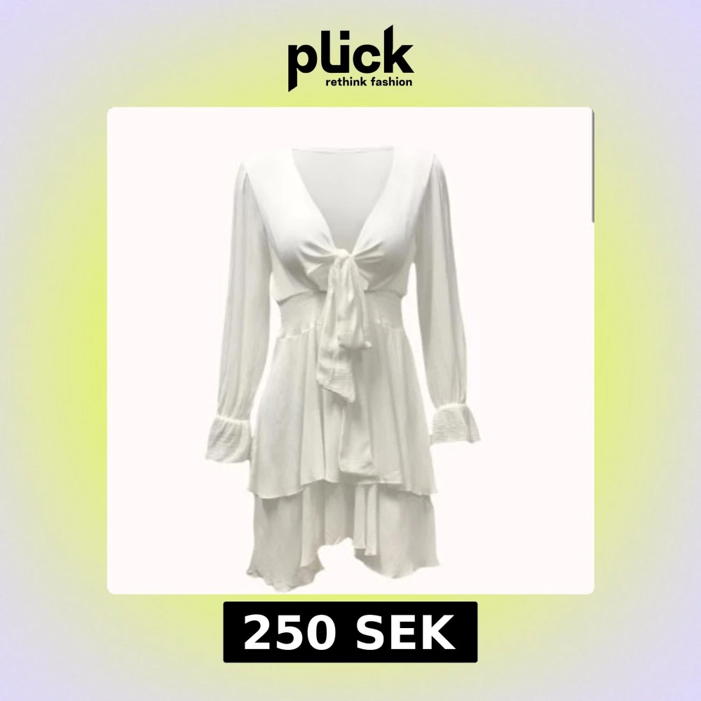 Superfin vit kortklänning med omlottknytning framtill, v-ringning och långa ärmar. Klänningen har volangdetaljer och markerad midja med smock. Perfekt för student eller avslutning! Helt ny aldrig använd😊