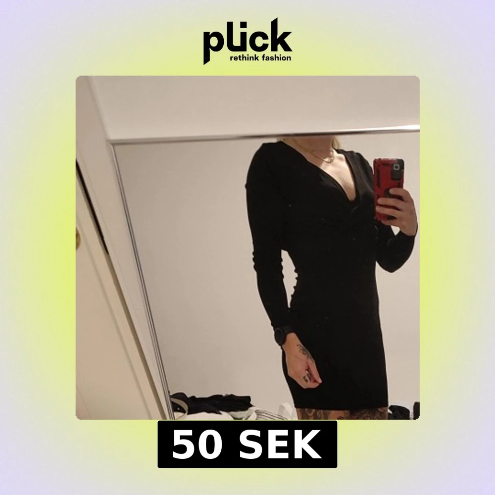 Säljer en svart, tight långärmad klänning med snygg v-ringning. Klänningen är kort och har en figurnära passform som framhäver siluetten. Croppad vid rumpan och väldigt bekvämt material.