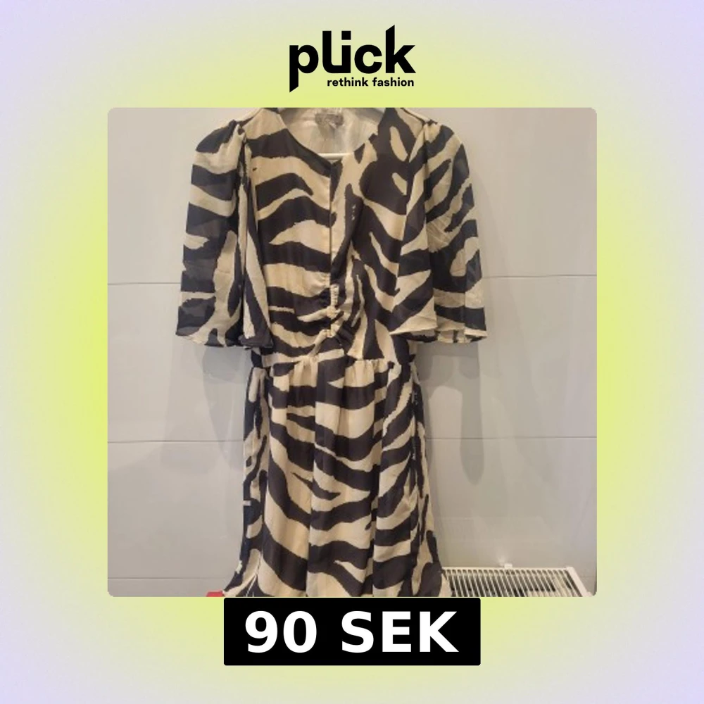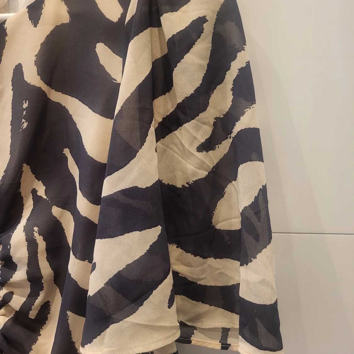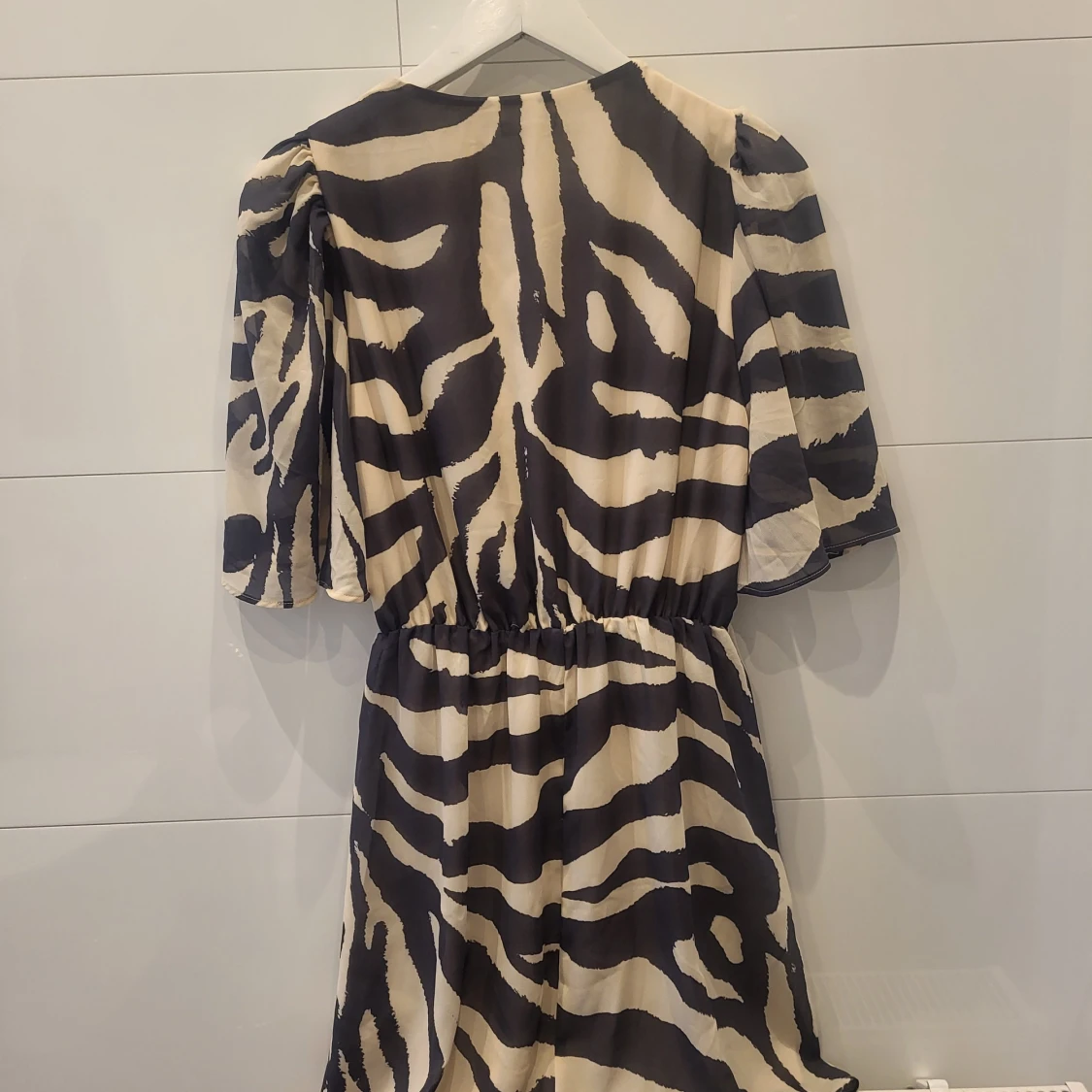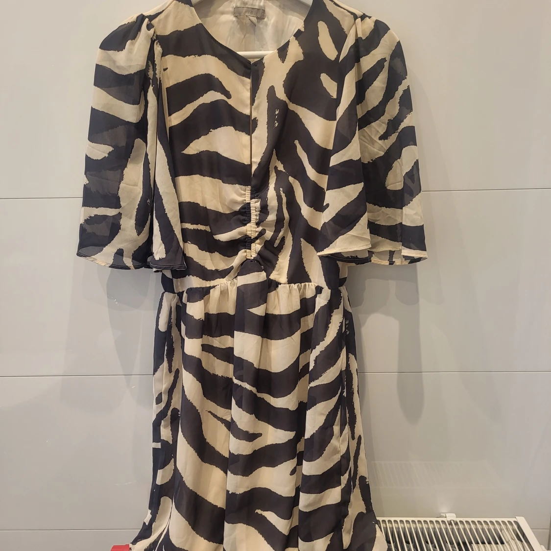 Cool kortklänning med svart och beige zebramönster. Klänningen har vida, korta ärmar och markerad midja med lätt rynk. Luftigt material som ger en avslappnad och trendig vibe. Perfekt för dig som vill sticka ut med ett djurmönster.