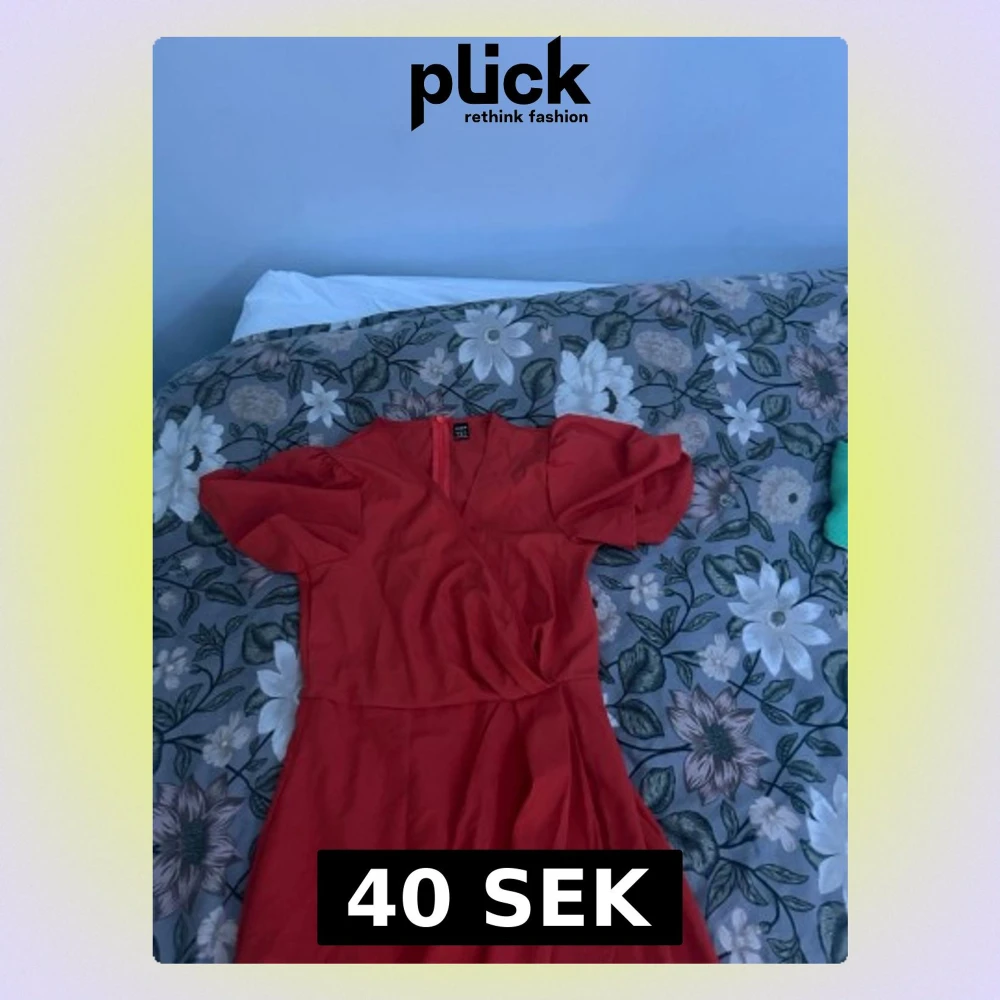 Trendig röd omlottklänning från SHEIN i storlek S. Klänningen har korta puffärmar, markerad midja och en lätt utställd kjol. Tillverkad i ett mjukt, vävt material som ger en snygg siluett. Perfekt för dig som vill sticka ut med färg!