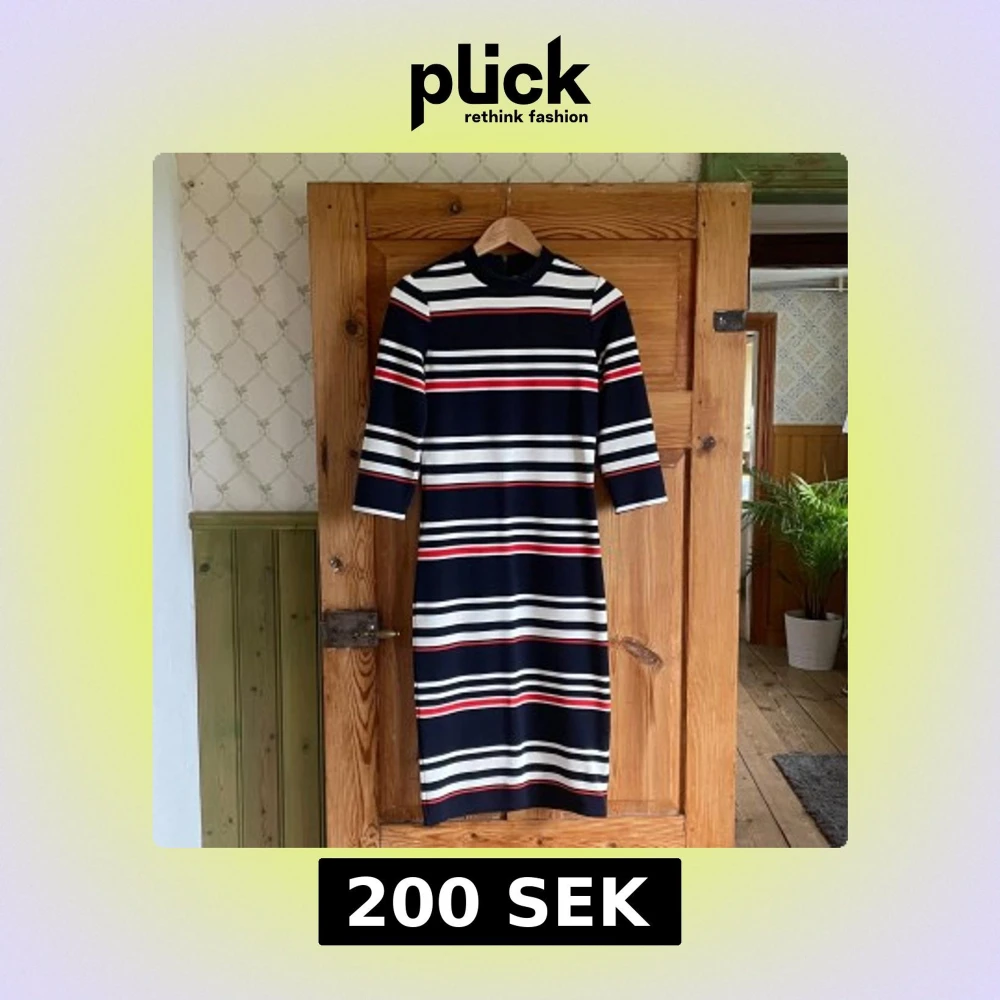 Snygg randig klänning från Yessica i marinblått, vitt och rött. Modellen är knälång med trekvartsärm och har en smickrande passform. Klänningen har dragkedja i ryggen och är gjord i mjukt, stretchigt material som känns bekvämt hela dagen.