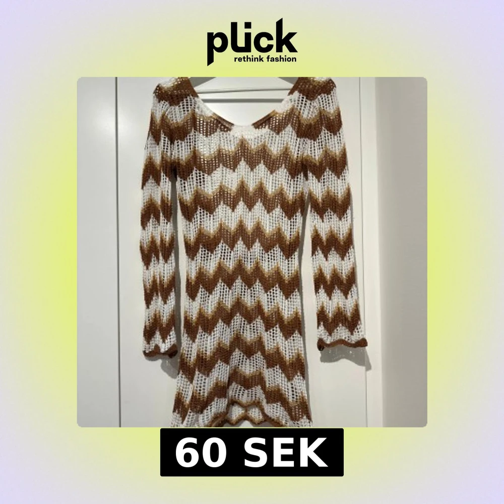 Säljer en snygg stickad klänning i brunt och vitt med ett zigzag-mönster. Klänningen har långa ärmar och en knytning i ryggen. Perfekt för en trendig look!