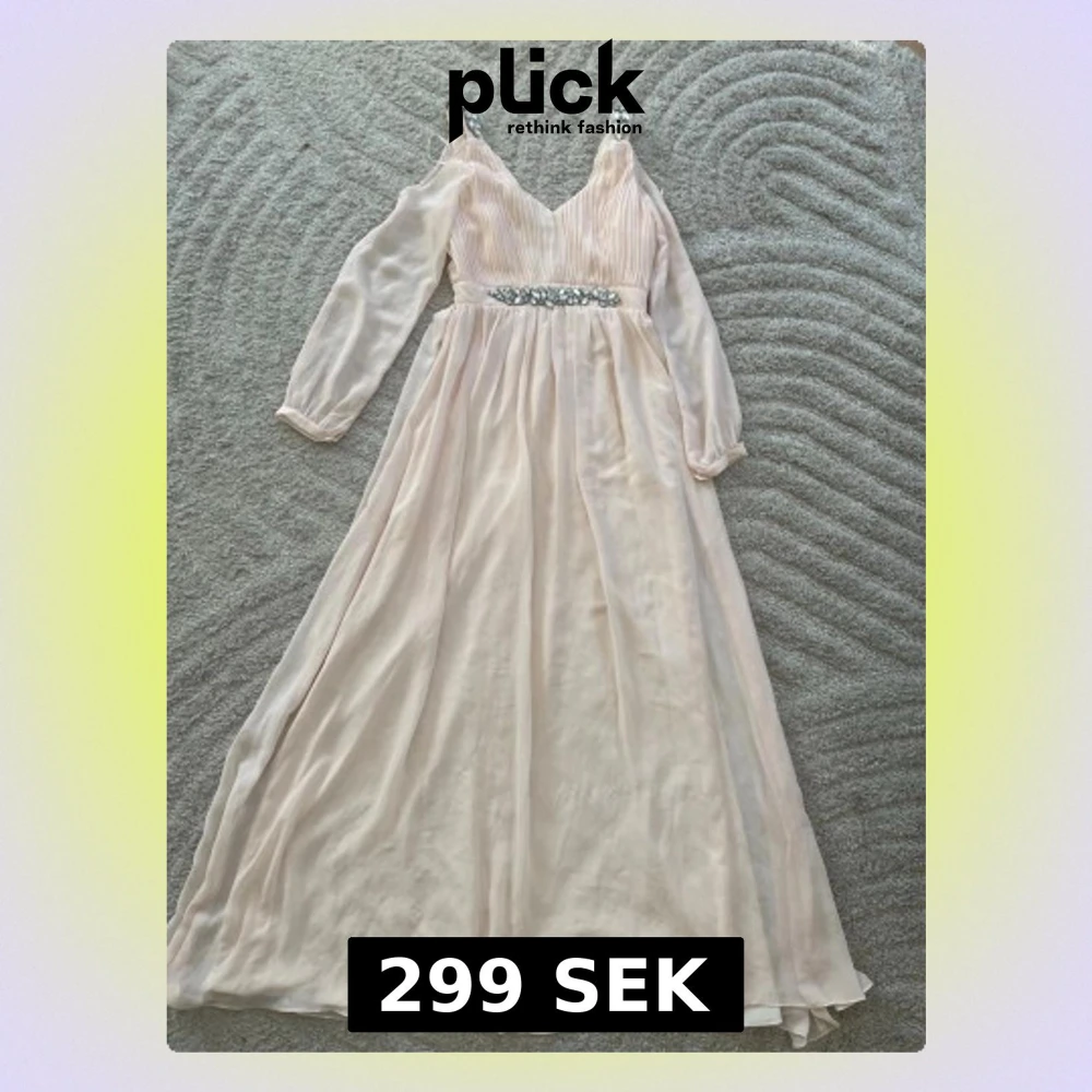 Elegant ljusrosa långklänning i chiffong med plisserad överdel och långa transparenta ärmar. Midjan pryds av en rad glittrande strassdetaljer. Klänningen har v-ringning och ett romantiskt, svepande fall.