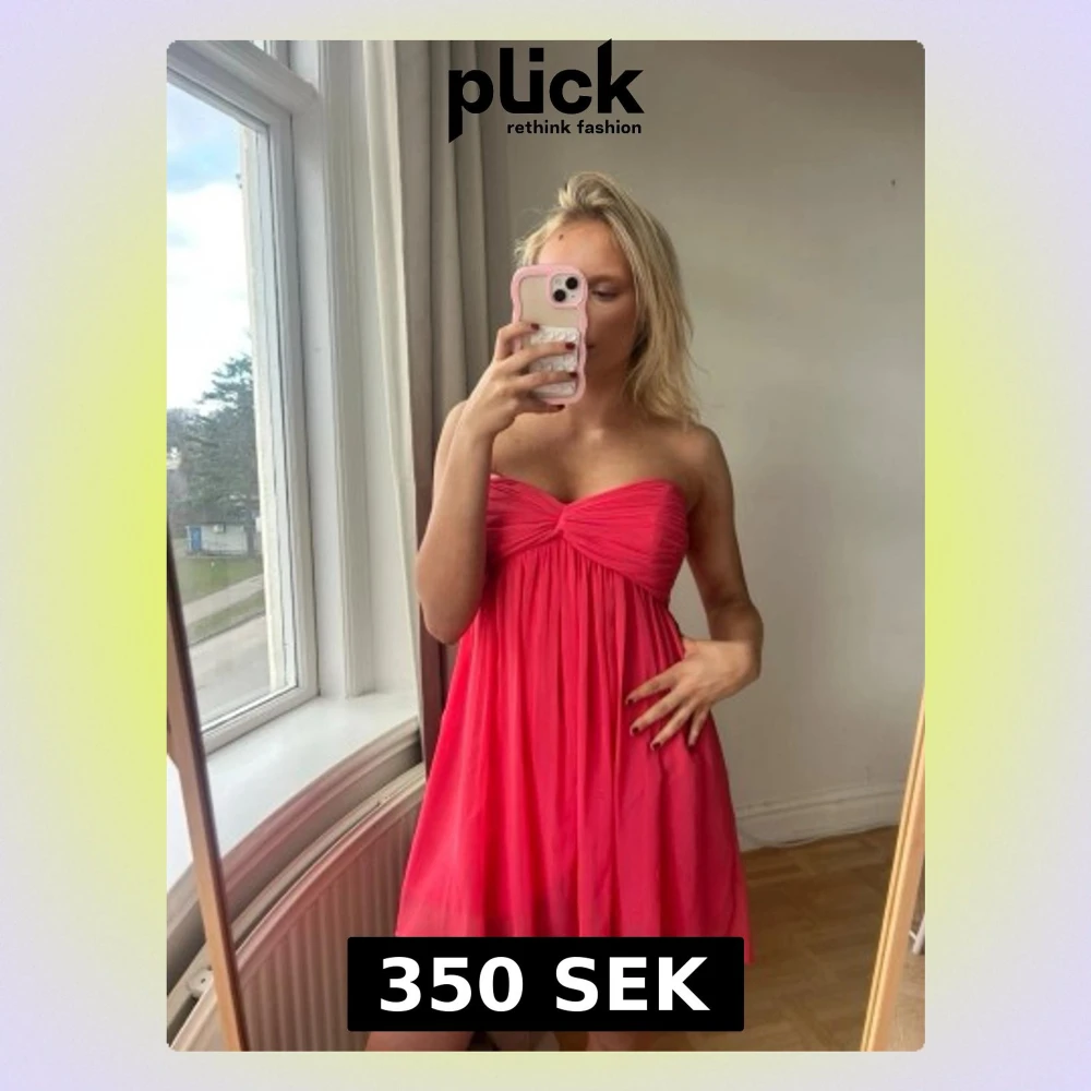Säljer en söt axelbandslös rosa kortklänning med twistad detalj vid bysten och ett luftigt, flowy tyg. Perfekt för sommarens alla tillfällen och ger en riktigt fräsch vibe. OBS ! Den är ish sönder vid dragkedjan dvs går inte att dra upp hela vägen som jag visar , går förmodligen att laga enkelt med olja eller så har inte försökt så💖