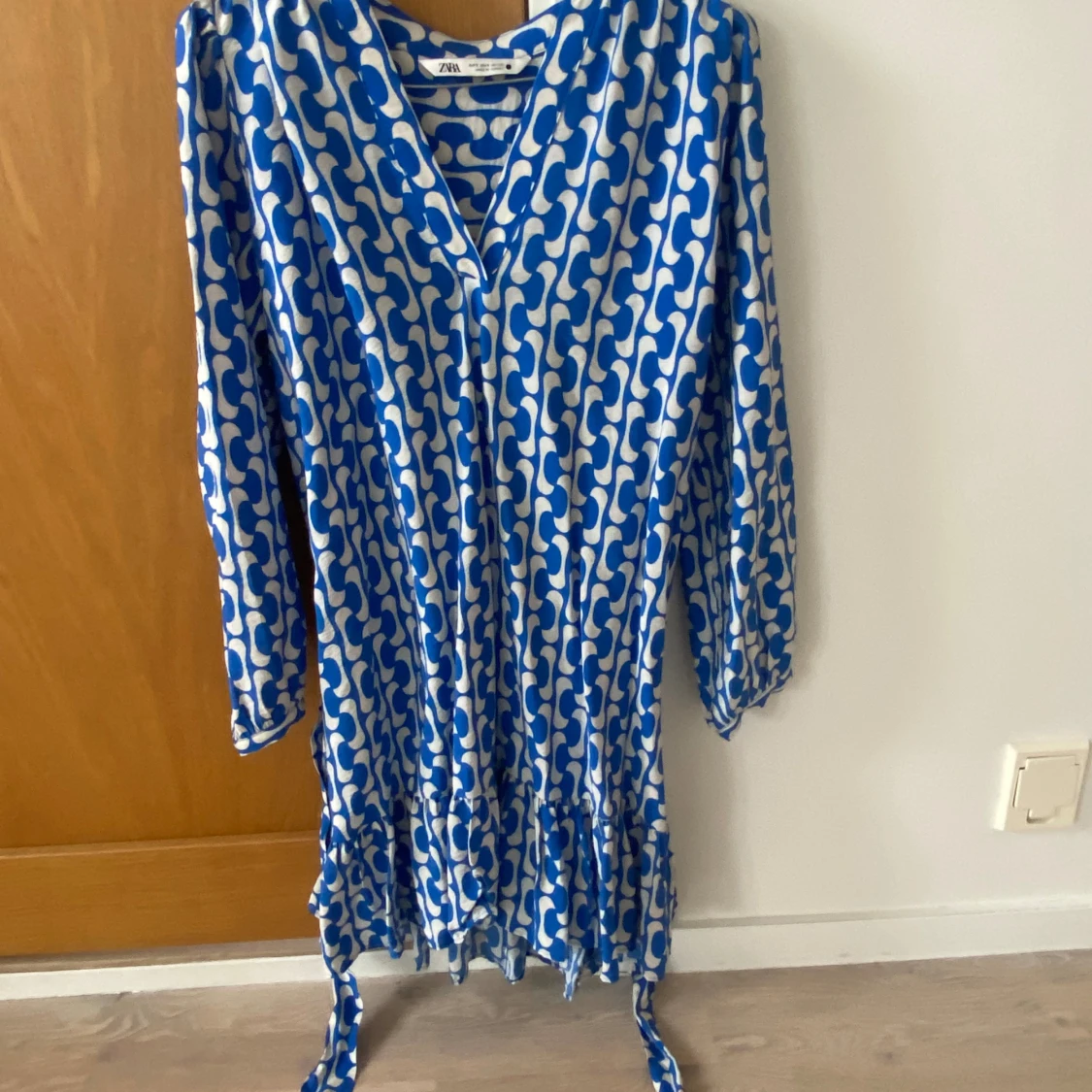 Jättefin kort v-ringad sommarklänning med snörning i midjan, stl S, endast använd en gång! Härligt luftigt material (85% viskos)!