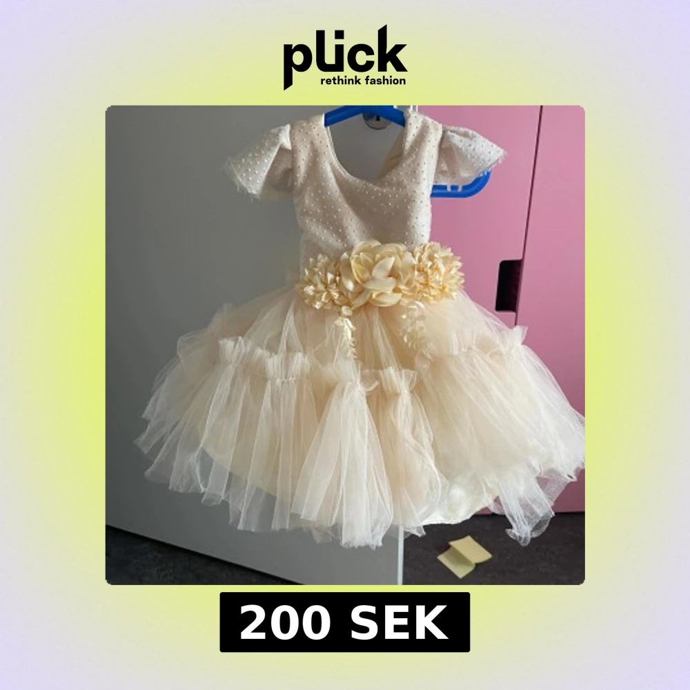 Superfin champagnefärgad prinsessklänning med puffiga korta ärmar, pärldetaljer på överdelen och stor blomma framtill i midjan. Kjolen är fluffig med lager av tyll och baktill finns en stor rosett. Perfekt för speciella tillfällen och ger en magisk känsla.passar upp till två år