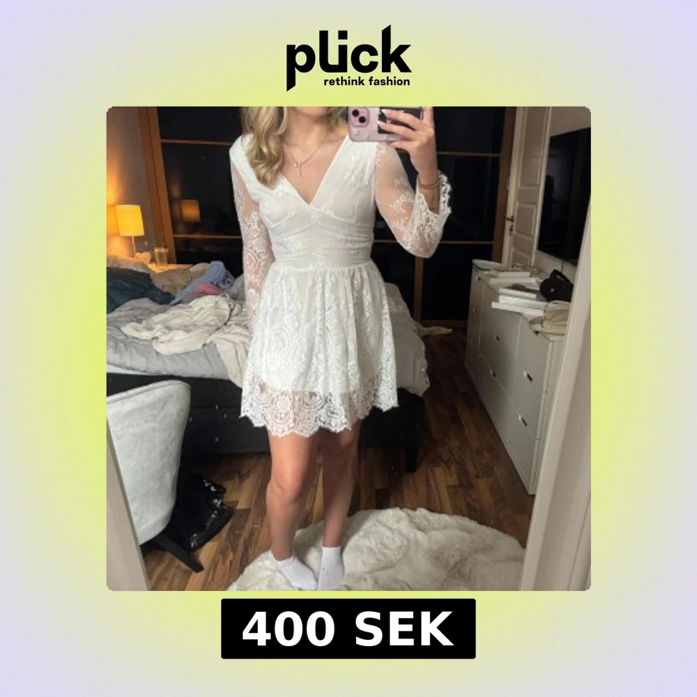 Säljer en vacker vit spetsklänning med långärmade ärmar och en elegant öppen rygg. Klänningen har en v-ringad hals och är perfekt för speciella tillfällen. Den är tillverkad i ett fint spetsmaterial. Går att dra upp dragkedjan ytterligare, men behövs assistans